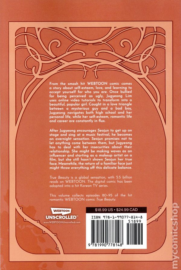 Volume 7 - 1st printing. Story and art by Yaongyl. Perfect for readers of graphic novels, manhwa, webcomics + young adult contemporary romance with the makeover and love-triangle tropes. Additionally, fans of The Kissing Booth, Cinderella-sque stories, and K-dramas like 200 Pounds Beauty & Oh My Venus will enjoy this series. Mastering the art of makeovers, Jugyeong Lim navigates high school and then college, while her self-esteem, romantic life, and career are constantly in flux… Jugyeong Lim has been treated unfairly by her family and bullied by her enemies due to being perceived as ugly. She learns how to use makeup by binge-watching online video tutorials. As she slowly masters the art of makeovers, her dramatic transformation leads to overwhelming popularity and fame. After Jugyeong encourages Seojun to get up on stage and sing at a music festival, he becomes an overnight sensation. Seojun promises not to let anything come between them, but Jugyeong has to deal with her insecurities about their relationship. She might be making waves as an influencer and starting as a makeup artist on a film, but she still hasnt shown Seojun her true face. Meanwhile, the return of a familiar face just might throw everything off this delicate balance. This volume collects episodes 80–95 of the hit romantic WEBTOON comic True Beauty. Softcover, 6-in. x 9-in., 288 pages, full color. Cover price $18.99.