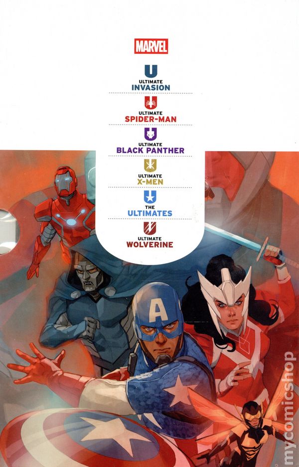 Set Includes 6 Volumes (with Slipcase) - Printings May Vary. Written by Jonathan Hickman, Deniz Camp, Peach Momoko, and Bryan Hill. Art by Bryan Hitch. The ULTIMATE entry point to the UNIVERSE everyones talking about. This box set collects the groundbreaking first volumes of Marvels Ultimate Universe — the blockbuster line-wide relaunch thats taken the industry by storm. Inside, youll find: Ultimate Invasion By Jonathan Hickman & Bryan Hitch The Maker plots to ensure that Earths Mightiest Heroes never become heroes at all — and then he can reshape a defenseless universe into exactly what he wants it to be! Ultimate Spider-Man Vol. 1: Married With Children By Jonathan Hickman, Marco Checchetto & David Messina The world needs a hero: Step forward, Peter Parker! But this older, wiser web-slinger must balance his costumed duties with his responsibilities as a husband and a father! Ultimate X-Men Vol. 1: Fears and Hates By Peach Momoko In Japan, urban legends have sprung to life, bringing unusual new powers with them. Meet Armor, Maystorm and a new group of X-Men — the likes of which youve never seen before! Ultimate Black Panther Vol. 1: Peace and War By Bryan Hill, Stefano Caselli & Carlos Nieto As Khonshu and Ra expand their control of the African continent, the lone bulwark against them — the isolated nation of Wakanda — will send forth its champion…its king: the Black Panther! Ultimates Vol. 1: Fix the World By Deniz Camp, Jonathan Hickman, Juan Frigeri, Phil Noto & Stefano Caselli Tony Stark, A.K.A. Iron Lad, has begun building a network of super-powered heroes to restore freedom and free will to a world ruled from the shadows! Together, they are the Ultimates! Ultimate Wolverine Vol. 1: The Winter Soldier By Christopher Condon, Alessandro Cappuccio & Alex Lins To maintain control of their corner of the world, Magik, Colossus and Omega Red deploy their most lethal weapon: the Winter Soldier! But who is the man behind the mask…with the claws? Softcover (6 Volumes with Slipcase), 1,040 pages (Total), full color. Rated T+ Cover price $120.00.