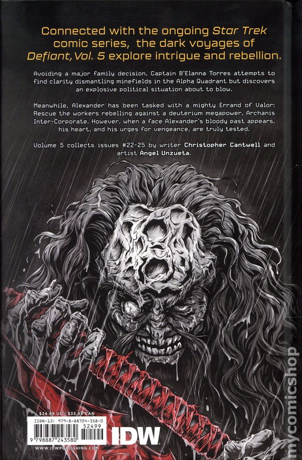 Volume 5 - 1st printing. "No Old Warriors!" Collects Star Trek: Defiant (2023 IDW) #22-25. Written by Christopher Cantwell. Art by Angel Unzueta. Cover by Takashi Okazaki. Connecting with the voyages of the ongoing Star Trek comic series, Defiant, Vol. 5 delves into intrigue and rebellion! Avoiding a major family decision, Captain BElanna Torres attempts to find clarity dismantling minefields in the Alpha Quadrant, but discovers an explosive political situation about to blow. Meanwhile, Alexander has been tasked with a mighty Errand of Valor: rescue the workers rebelling against a deuterium mega-power, Archanis Inter-Corporate. However, when a face from Alexanders bloody past appears, his heart, and urges for vengeance, are truly tested. Softcover, 112 pages, full color. Cover price $24.99.