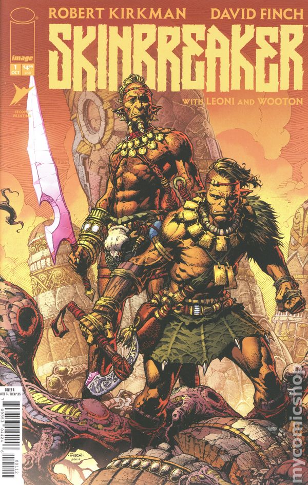 2nd Printing, Cover A. Written by Robert Kirkman. Art by David Finch, Annalisa Leoni. Cover by David Finch, Annalisa Leoni. SERIES PREMIERE FOR FANS OF INVINCIBLE UNIVERSE: BATTLE BEAST COMES YOUR NEW FAVORITE SERIES! ** The dream team of ROBERT KIRKMAN** (THE WALKING DEAD_, _INVINCIBLE) and superstar artist DAVID FINCH (Batman, New Avengers) present a visionary action epic unlike anything youve ever seen. Enor has led his tribe for many seasons, but his time as Chieftan is coming to an end. He wields the mighty SKINBREAKER, but at his age, he can barely lift it. Will Enors reluctant heir, Anok, take over before their world falls to ruin? As a bloody power struggle begins, an even bigger threat lurks in the darkness beyond their village. SKINBREAKER tells the story of a people on the verge of collapse and their fight for survival as the many threats they face close in for the kill. 32 pages, full color. Rated T+ Cover price $4.99.