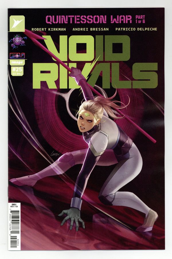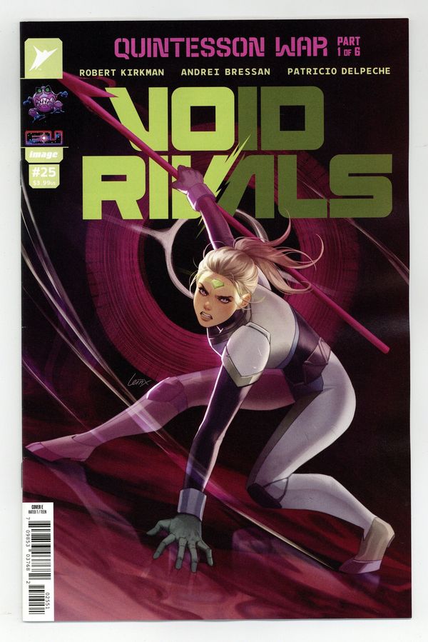 $20.00Limited 1 for 50 Retailer Incentive Variant Cover.(W) Robert Kirkman (A) Andrei Bressan, Patricio Delpeche (CA) Leirix Li WAR COMES TO THE SACRED RING! The QUINTESSON WAR begins! No one could prepare for an all out assault from the Quintessons! Darak and Solila must lead their people in the deadliest war they’ve ever faced! When the dust is settled the status quo of Void Rivals will be forever changed! Cover price $3.99.