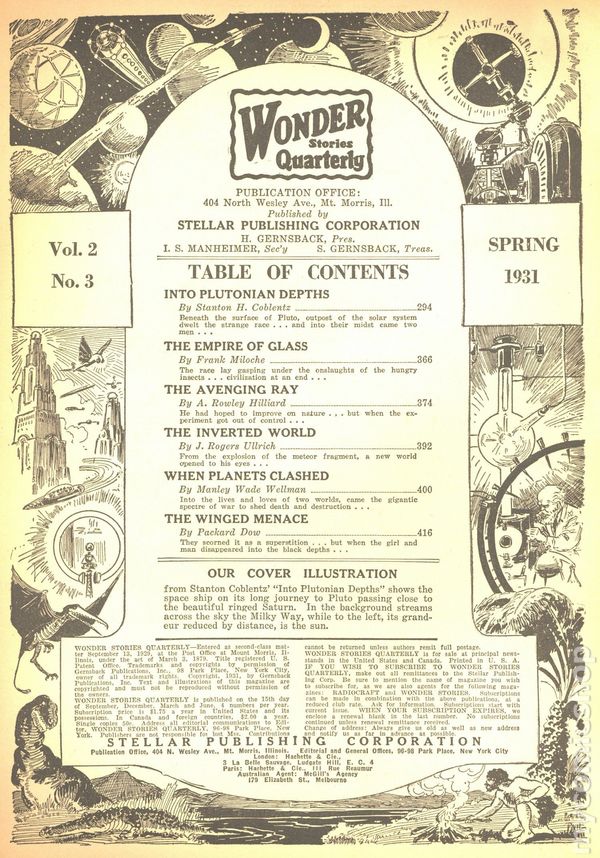 Summer 1930. Stories by R.H. Romans, Nat Schachner and Arthur L. Zagat, Otfrid von Hanstein, Henrik Dahl Juve, D.D. Sharp, and David H. Keller M.D. Edited by Hugo Gernsback. 8.5-in. x 11.75-in.; black and white with color cover; 144 newsprint pages. Cover price $0.50.