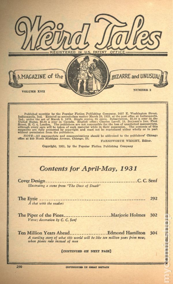 Volume 13, Issue 3 - March 1929. Edited by FarThe People of Pan by Henry S. Whitehead; The Hounds of Tindalos by Frank Belknap Long; Additional stories by August Derleth, Edmond Hamilton, Seabury Quinnnsworth Wright. Horror and Fantasy stories in the pulp style. 6.75-in. x 10-in.; 128 newsprint pages, text (with B&W illustrations). Cover price $0.25.