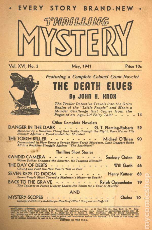 May, 1941. Colonel Crum story 'The Death Elves' by John H. Knox. Also includes stories from G.T. Fleming-Roberts, Michael O'Brian, Seabury Quinn, Will Garth, Henry Kuttner, and Ralph Oppenheim Cover price $0.10.