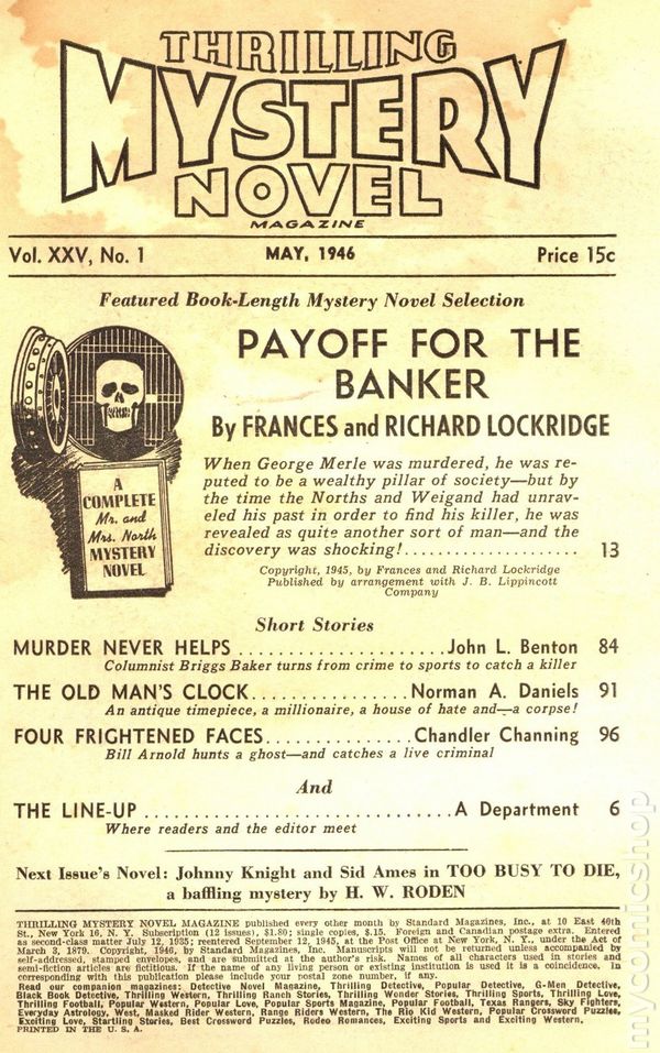 $79 THRILLING MYSTERY NOVEL MAGAZINE Jan. 1947, v.26 #1 GD/VG Murder at Cambridge $400 Thrilling Mystery Novel 1947 January, #72. CGC 6.5. Skull cover by Belarski Pulp Clicking on the links to the eBay listings shown above and then making a purchase may result in MyComicShop earning a commission from the eBay Partner Network.