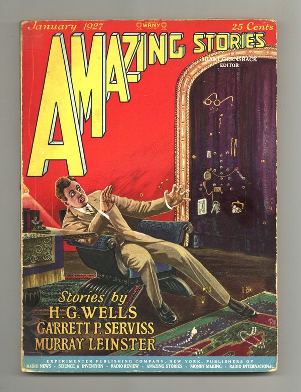 January 1927. Cover art by Frank R. Paul. Stories by H.G. Wells ("The First Men in the Moon" part 2), Murray Leinster ("The Red Dust"), A. Hyatt Verrill, Dr. Miles J. Breuer ("The Man with the Strange Head -- Breuer's first published work), and Garrett P. Serviss. Edited by Hugo Gernsback. 8-in. x 11-in.; black and white with color cover; 96 newsprint pages. Cover price $0.25.