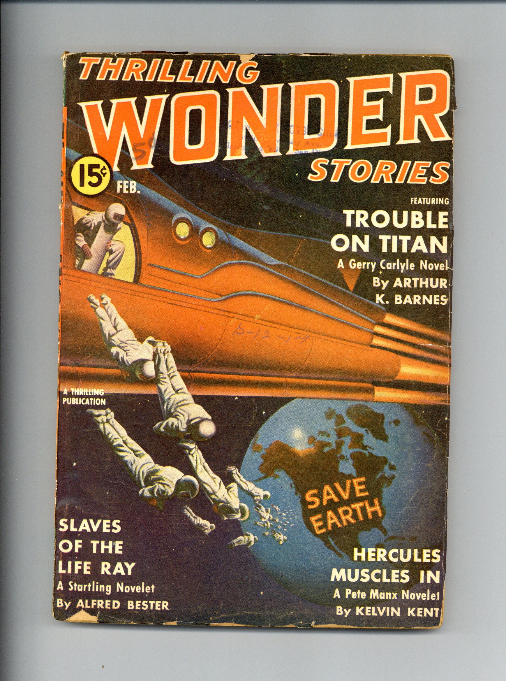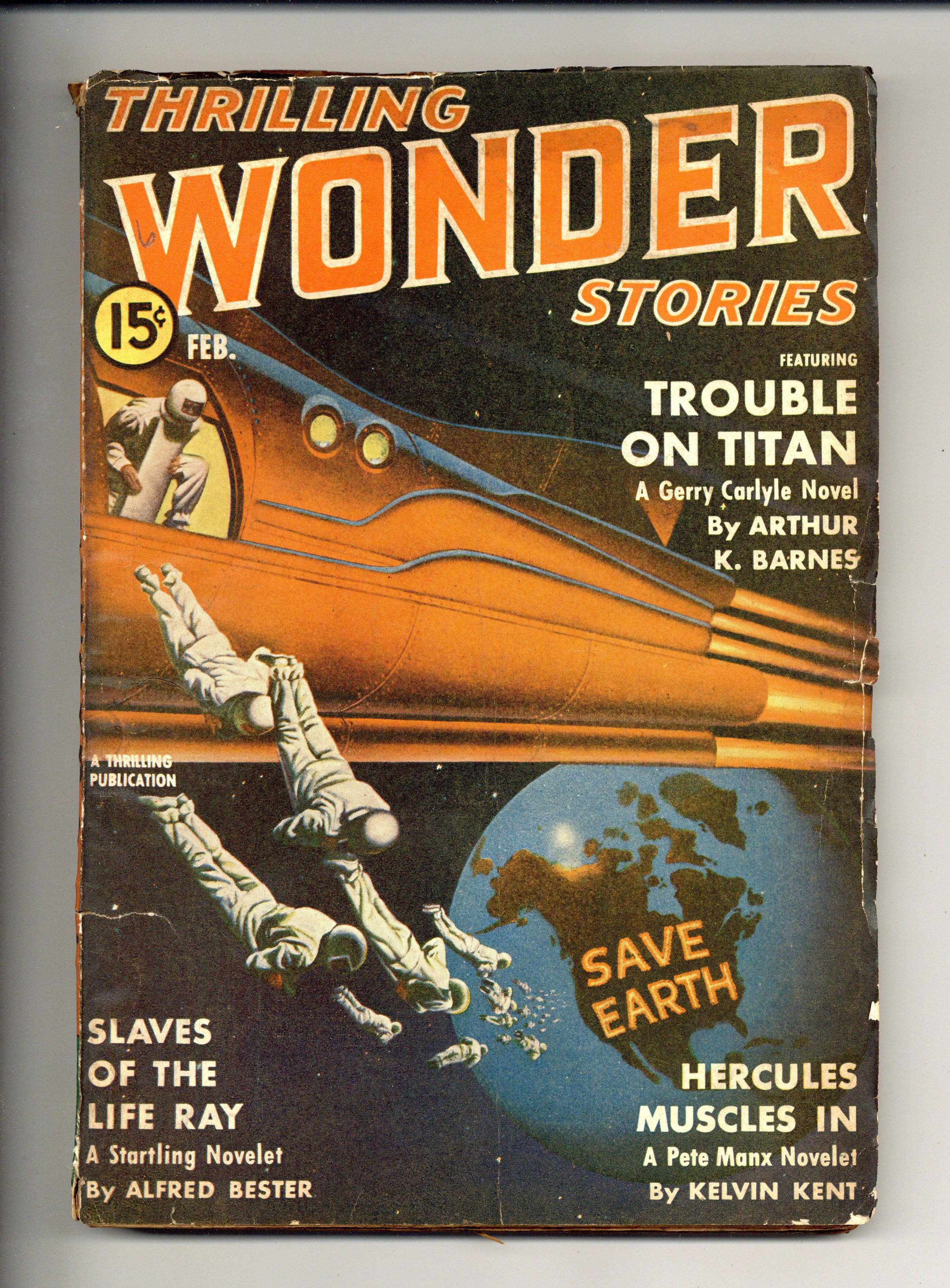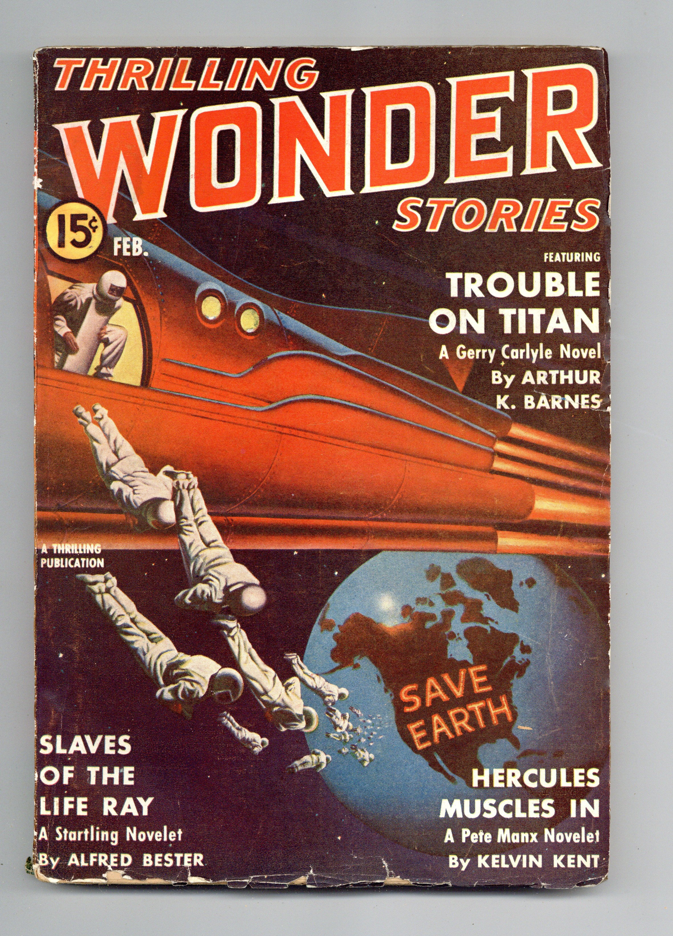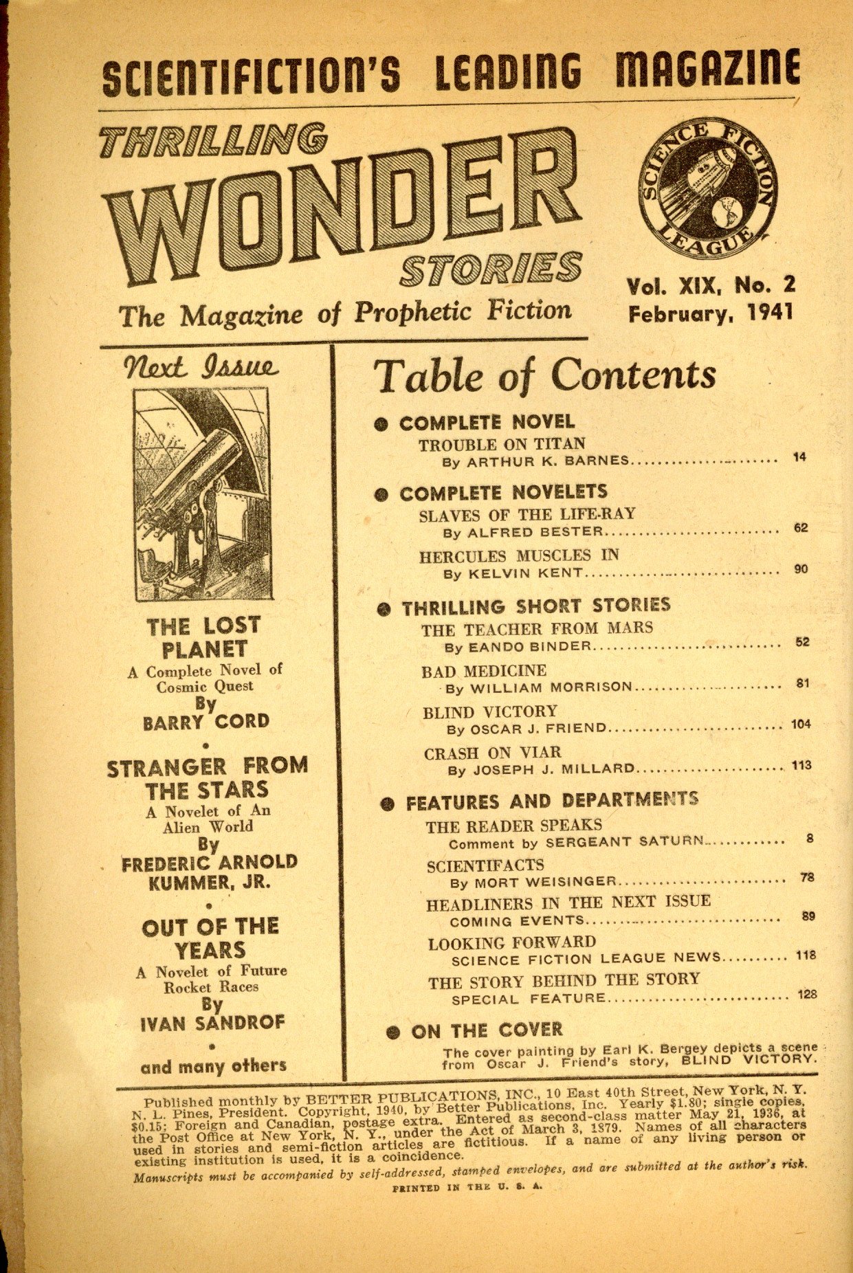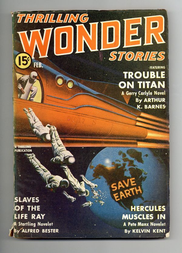 Feb 1941. Cover by Earle K. Bergey. Stories by Arthur K. Barnes, Alfred Bester, Kelvin Kent, Eando Binder, William Morrison, Oscar J. Friend, and Joseph J. Millard. Scientifacts column by Mort Weisinger. 7-in. x 10-in.; black and white; 128 newsprint pages. Cover price $0.15.