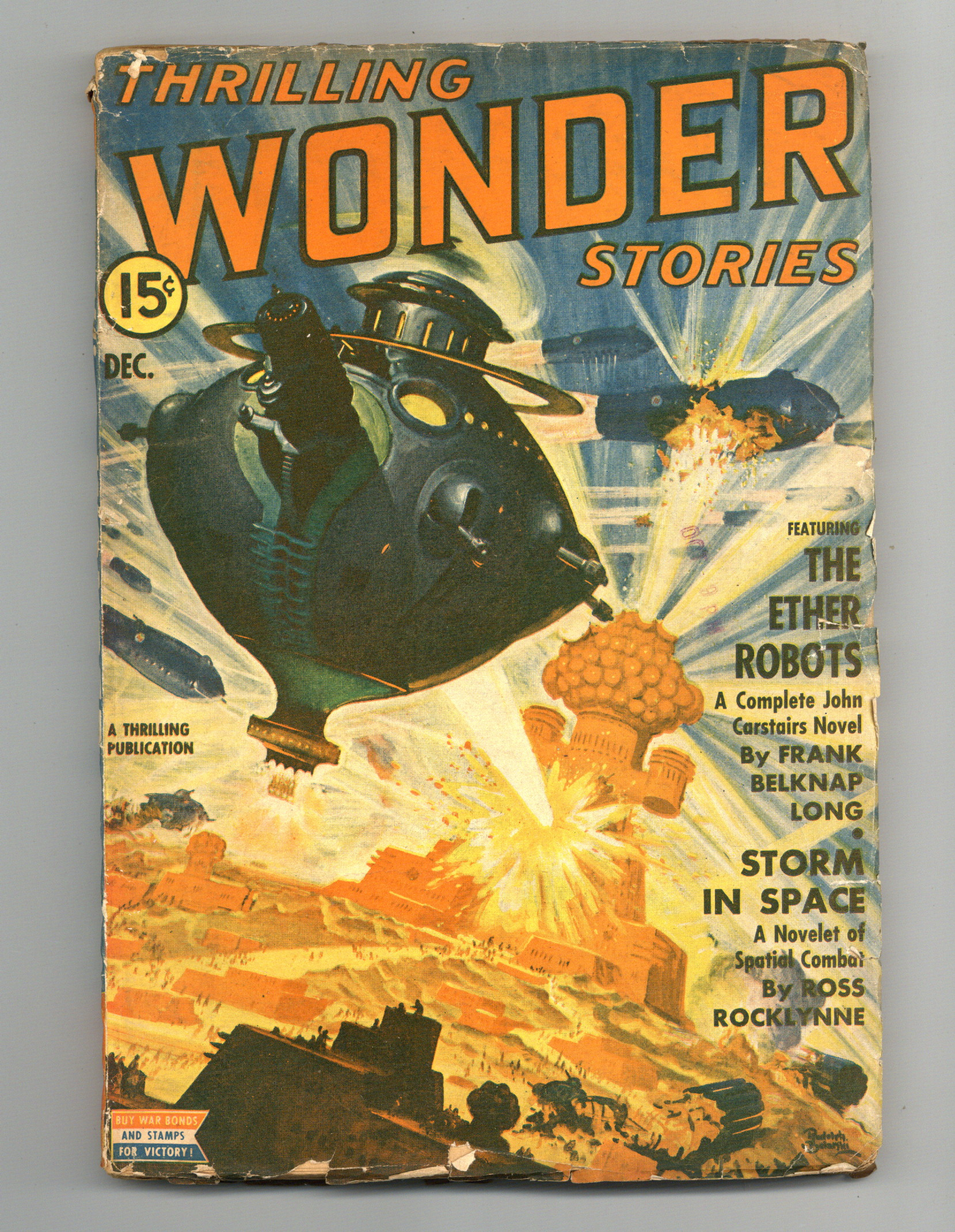 Dec 1942. Cover by Rudolph Belarski. Stories by Frank Belknap Long, Ross Rocklynne, Ray Cummings, Lloyd Norse, Barry Cord, Henry Kuttner, and Douglas Stapleton. 7-in. x 10-in.; black and white; 130 newsprint pages. This cover was reused on the Sept/Oct 1989 cover of American Heritage. Cover price $0.15.