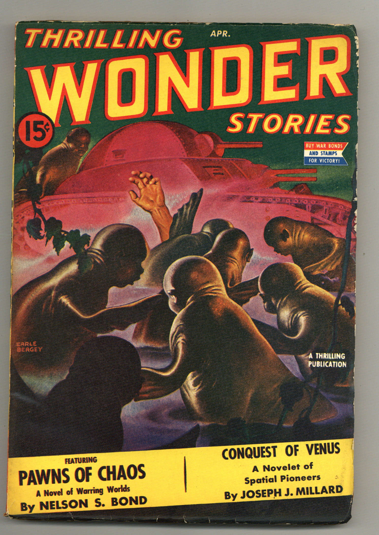 Volume 24, Issue 1 - April, 1943. Cover by Earle K. Bergey. Stories by Nelson S. Bond, Joseph J. Millard, Malcolm Jameson, Frank Belknap Long, and William Morrison. Dr. Seuss illustration (small "Buy War Savings Bonds & Stamps" ad). 7-in. x 10-in.; black and white; 134 newsprint pages. Cover price $0.15.