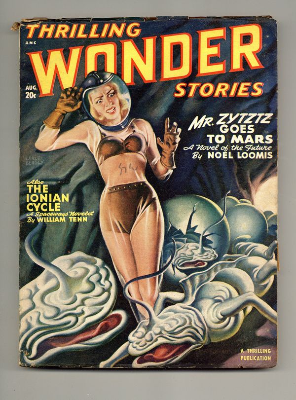 Aug 1948. Cover by Earl K. Bergey. Stories by William Tenn, Noel Loomis, Theodore Sturgeon, Ray Bradbury, Murray Leinster, Henry Kuttner, William Fitzgerald, Margaret St. Clair, and Wesley Long. Two Virgil Finlay illustrations. 7-in. x 10-in.; black and white; 148 newsprint pages. Cover price $0.20.