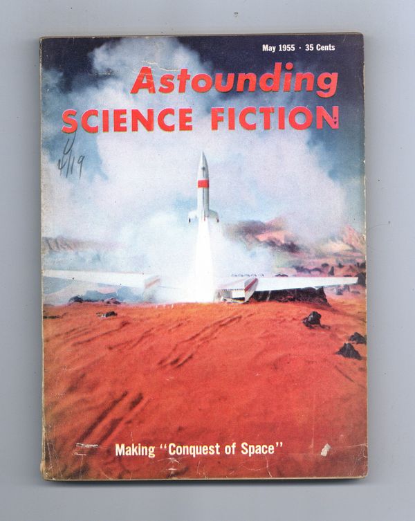 May 1955. Volume 55, Issue 3 - 1st printing. Science fiction stories by Poul Anderson ("The Long Way Home" part 2), Isaac Asimov, Everett B. Cole, Eric Frank Russell, and Algis Budrys. Illustrations by Freas and van Dongen. Article on "Conquest of Space" feature film with photos. Photo cover from "Conquest of Space". Softcover, 5.5-in. x 7.75-in.; 168 newsprint pages, B&W. Cover price $0.35.