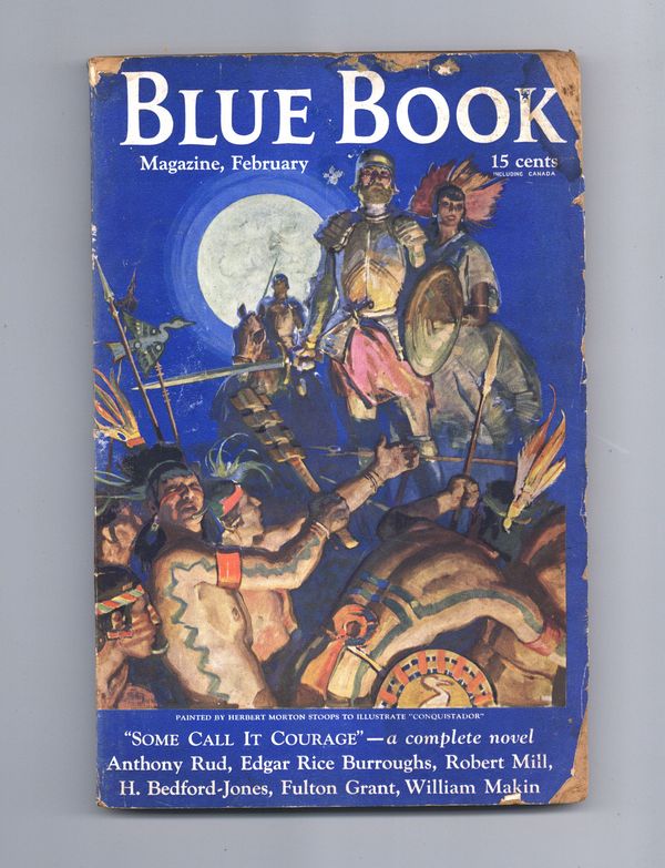 Feb 1936. Cover by Herbert Morton Stoops. Tarzan and the Immortal Men 4/6 Fiction by Edgar Rice Burroughs ("Tarzan and the Immortal Men" chapters 22-26; 19 pages; illustrations by Frank Hoban), Gregorio Somers, H. Bedford-Jones, Robert R. Mill, Bigelow Neal, Richard Howells Watkins, Arthur K. Akers, Fulton Grant, William J. makin, and Anthony Rud. Illustrations by Austin Briggs (10) and others. 6.5-in. x 10-in.; black and white; 144 newsprint pages. Cover price $0.15.