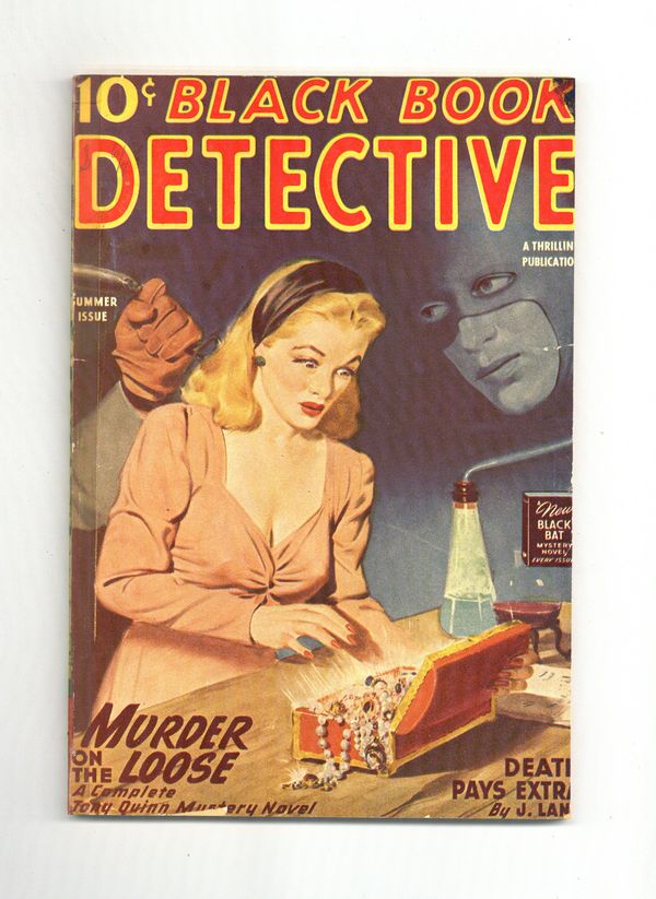 Summer 1945. The Black Bat in "Murder on the Loose" by "G. Wayman Jones" (Norman Daniels); "Murder Strikes Out" by John Gunderson; "Money to Burn" by David X. Manners; and "Death Pays Extra" by J. Lane Linklater. Pulp magazine format; black and white; 80 newsprint pages. Cover price $0.10.