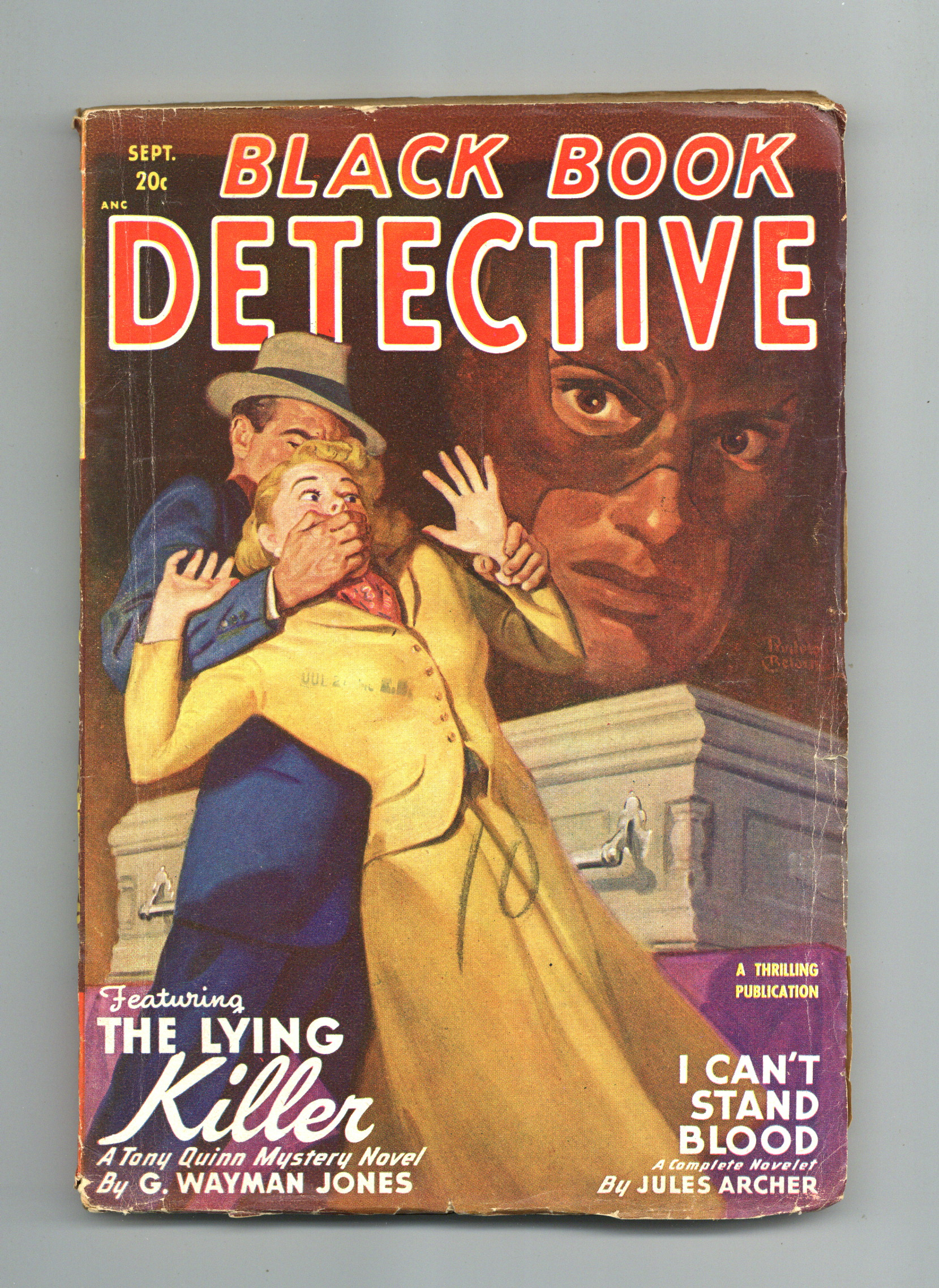 The Black Bat in "The Lying Killer" by "G. Wayman Jones" (Norman Daniels); "I Can't Stand Blood" by Jules Archer; "Death Needs a Key" by Nels Leroy Jorgensen; "Big Target" by Roger Fuller; "The Murder Obsession" by Wayland Rice; "Idea for Murder" by Robert Sidney Bowen; "The Widower" by Sam Merwin Jr.; "Who's That Knocking?" by Hal White; and "Thubway Tham's Deed of Mercy" by Johnston McCulley. Pulp magazine format; black and white; 144 newsprint pages. Cover price $0.20.