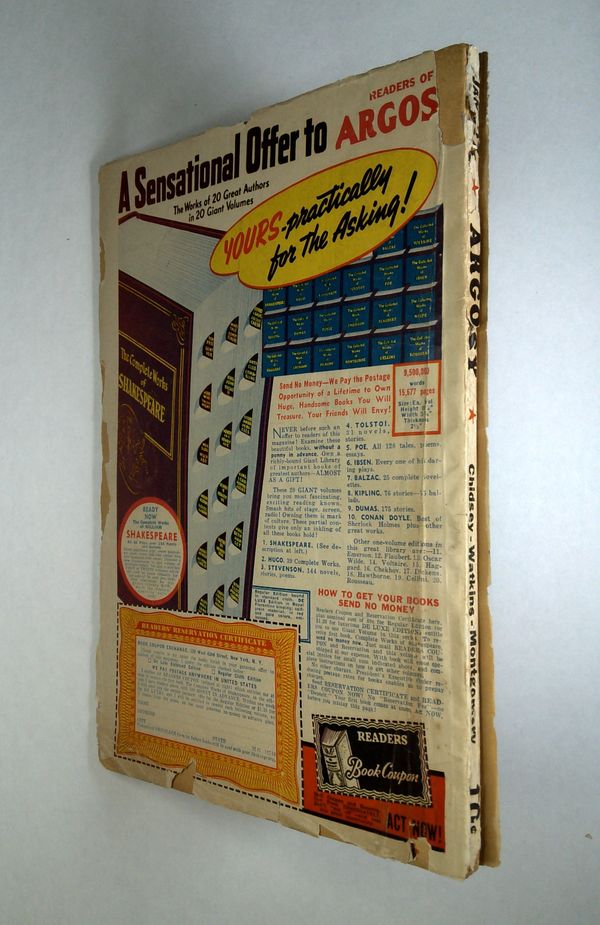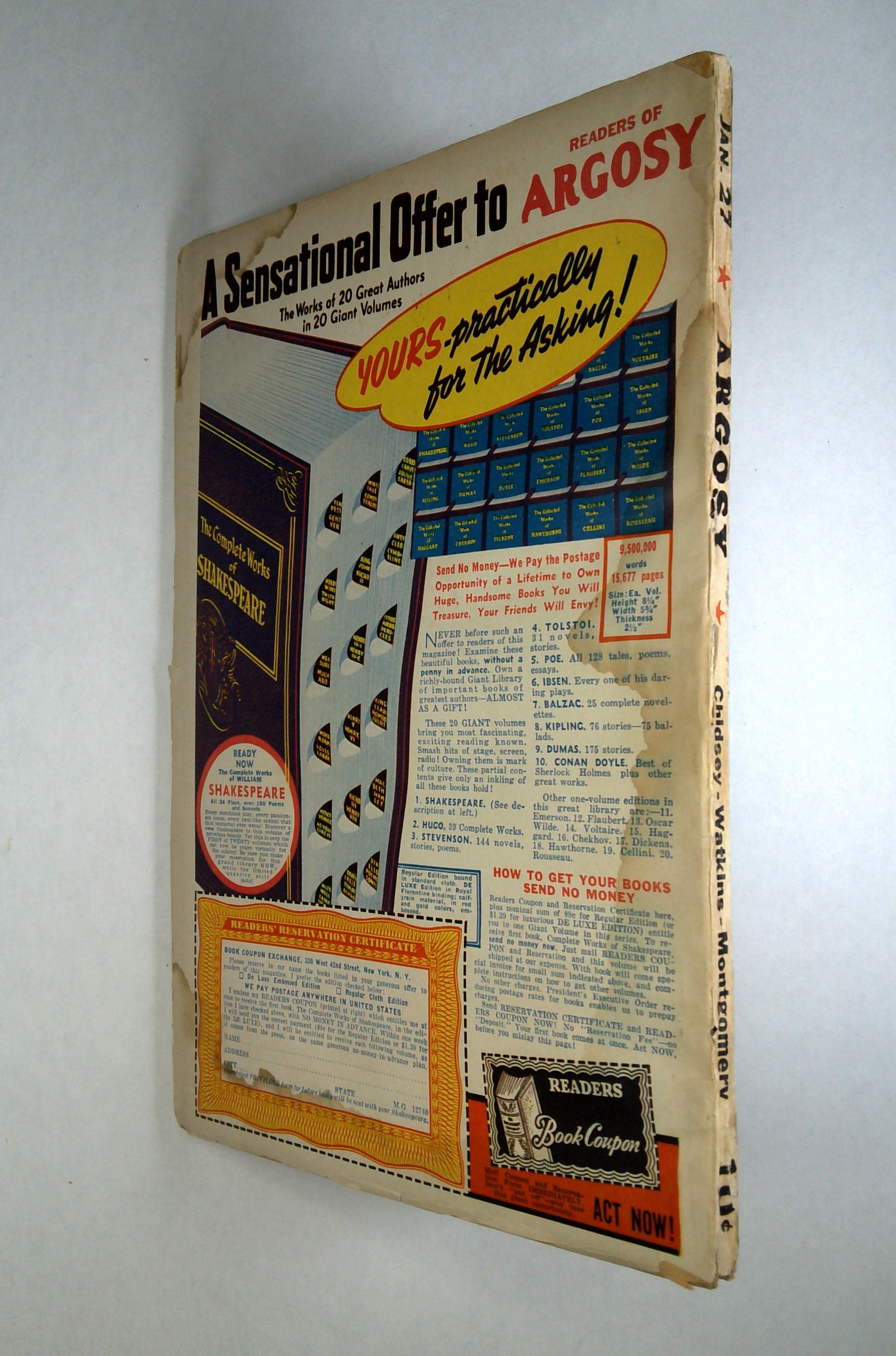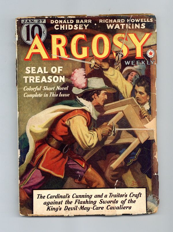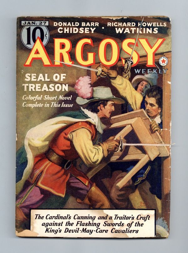 January 27, 1940. Cover by Rudolph Belarski. Stories include "Seal of Treason" by Murray R. Montgomery, "Crook's Tour" by Richard Howells Watkins, "Minions of Mars" (part 3) by William Gray Beyer, "The Dust on the Trail" by Arthur Lawson, "Sleepwalker in the Sun" by Charles Bonner, "Loot Lies Deep" (part 5) by Eustace L. Adams, "Never a Miss" by Donald Barr Chidsey, "Fate Wove a Rug" by C.D. Appleton and E.C. Goodwin, and "Men of Daring" by Stookie Allen. 7-in. x 10-in.; black and white; 132 newsprint pages. Cover price $0.10.