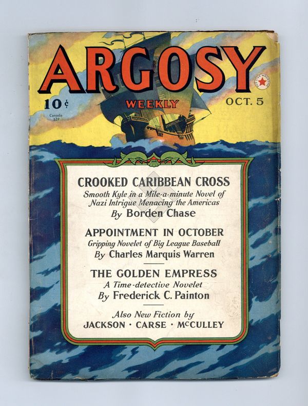October 5, 1940. Stories include "Rebel Take Arms" (part 2) by Robert Carse,"Senor Devil-may-care" (part 3) by Johnston McCulley, "Crooked Caribbean Cross" by Borden Chase, "Appointment in October" by Charles Marquis Warren, "The Golden Empress" by Frederick C. Painton, and "Marching as to War" by Eustace Cockrell. 7-in. x 10-in.; black and white; 112 newsprint pages. Cover price $0.10.