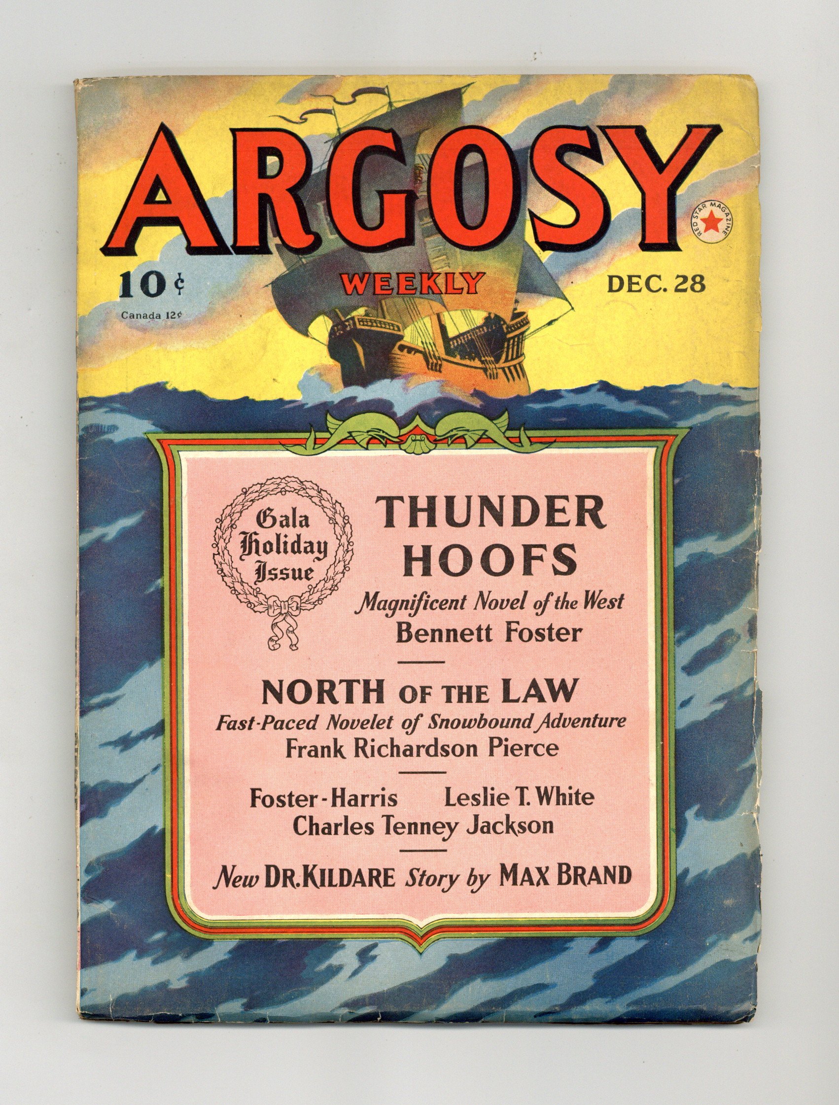 December 28, 1940. Stories include "Dr. Kildare's Crisis" (part 2) by Max Brand, "Fools Fly High" (part 4) by Louis C. Goldsmith, "Thunder Hoofs" (part 1) by Bennett Foster, "North of the Law" by Frank Richardson Pierce, "Oomph Cop" by Leslie T. White, "Weeble Coming Round the Mountain" by Foster-Harris, "Hold That Bull" by Charles Tenney Jackson, and "Men of Daring" by Stookie Allen. 7-in. x 10-in.; black and white; 112 newsprint pages. Cover price $0.10.
