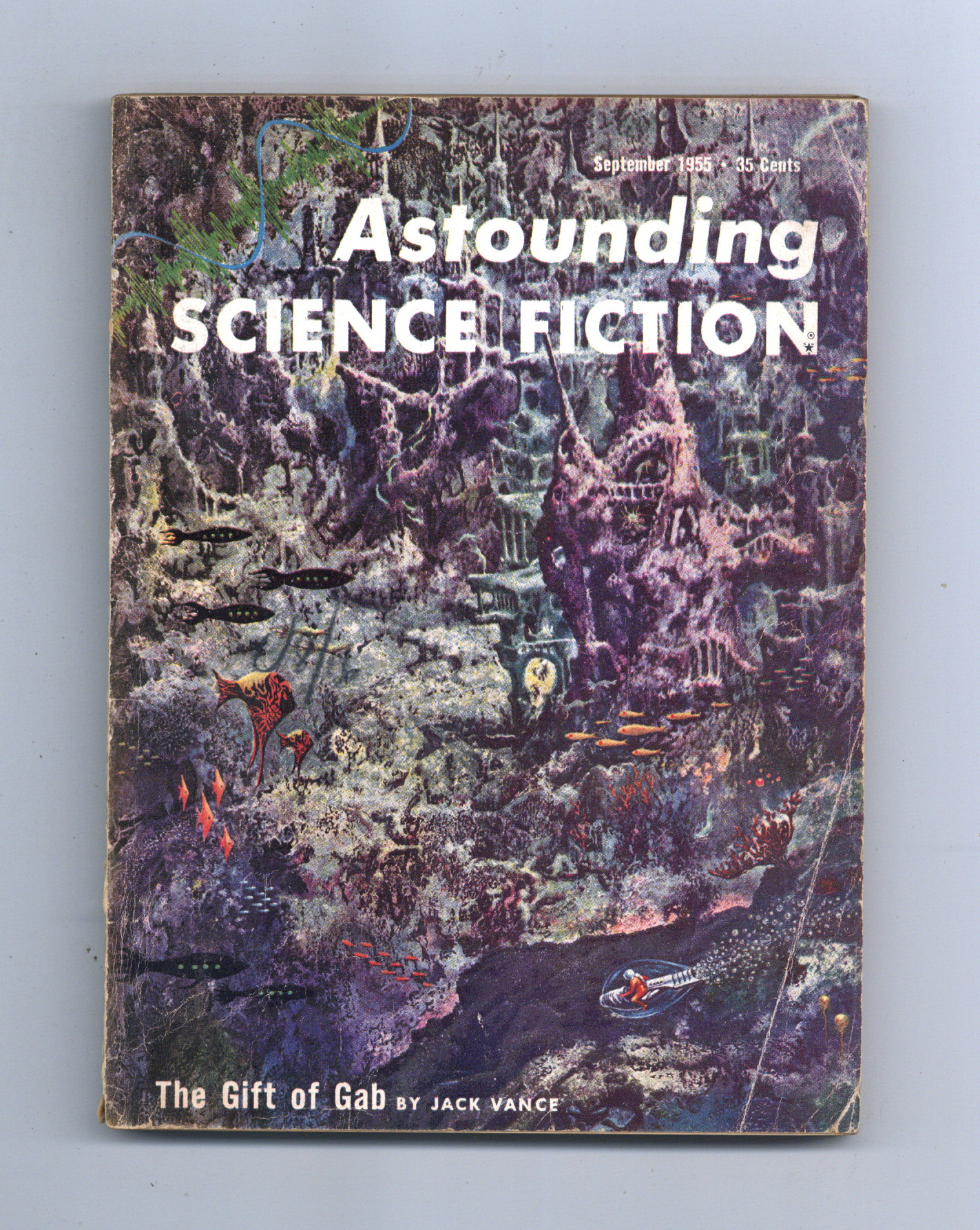 September 1955 - Volume 56, Issue 1 - 1st printing. Science fiction stories: "The Gift of Gab" by Jack Vance, "Aspirin Won't Help It" by John A. Sentry, "Blessed Are the Meek" by G.C. Edmondson, "Scrimshaw" by Murray Leinster, and "Call Him Dead" by Eric Frank Russell (Part 2). Article by Isaac Asimov. Illustrations by Freas, Poulton, and Van Dongen. Cover by Freas. Softcover, 5.5-in. x 7.75-in.; 162 newsprint pages, B&W. Cover price $0.35.