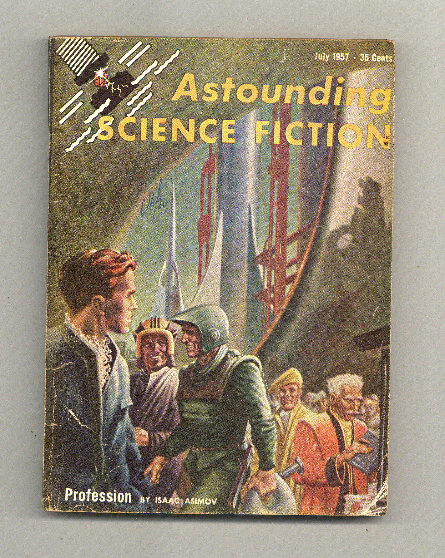 July 1957 - Volume 59, Issue 5 - 1st printing. Science fiction stories: "Profession" by Isaac Asimov, "Divine Right" by Lester del Rey, "Rum of the Mill" by Robert Silverberg, "Hot Potato" by Algis Budrys and "The Best Policy" by David Gordon. Illustrations by Freas. Article on sea urchins by Asimov. Cover by Freas. Softcover, 5.5-in. x 7.75-in.; 162 newsprint pages, B&W. Cover price $0.35.
