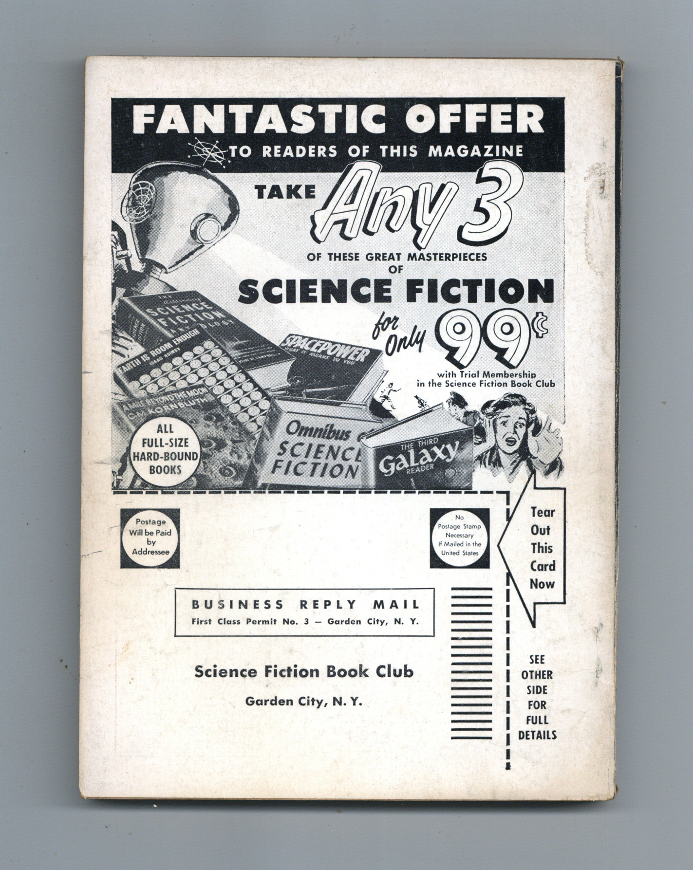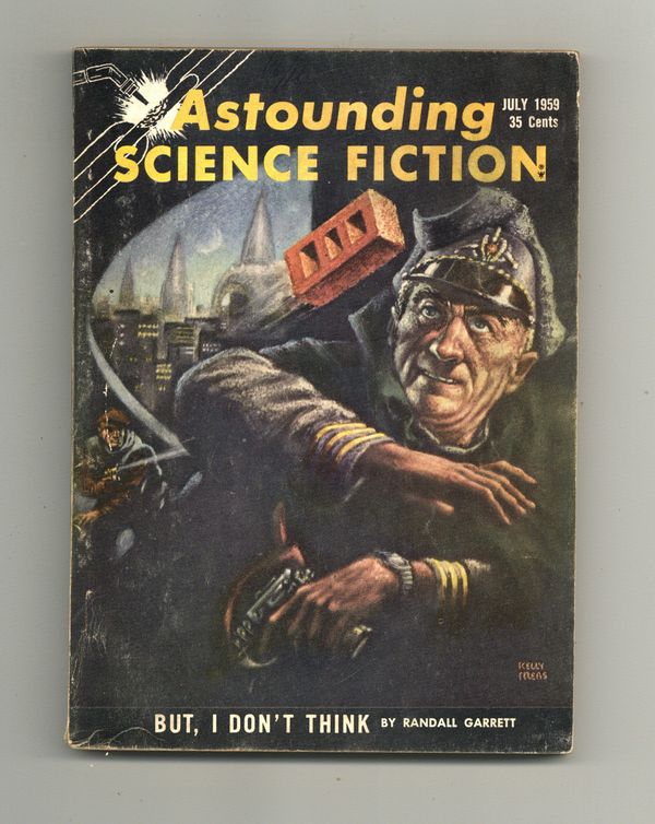 July 1959 - Volume 63, Issue 5 - 1st printing. Science fiction stories by Gordon R. Dickson ("Dorsai!" conclusion), Randall Garrett, Theodore L. Thomas, Algis Budrys, Christopher Anvil, and C.C. Beck (the comics artist). Illustrations by Freas, Martinez, Schoenherr, and van Dongen. Article on "artificial" elements by Isaac Asimov. Cover by Freas. Softcover, 5.5-in. x 7.75-in.; 162 newsprint pages, B&W. Cover price $0.35.