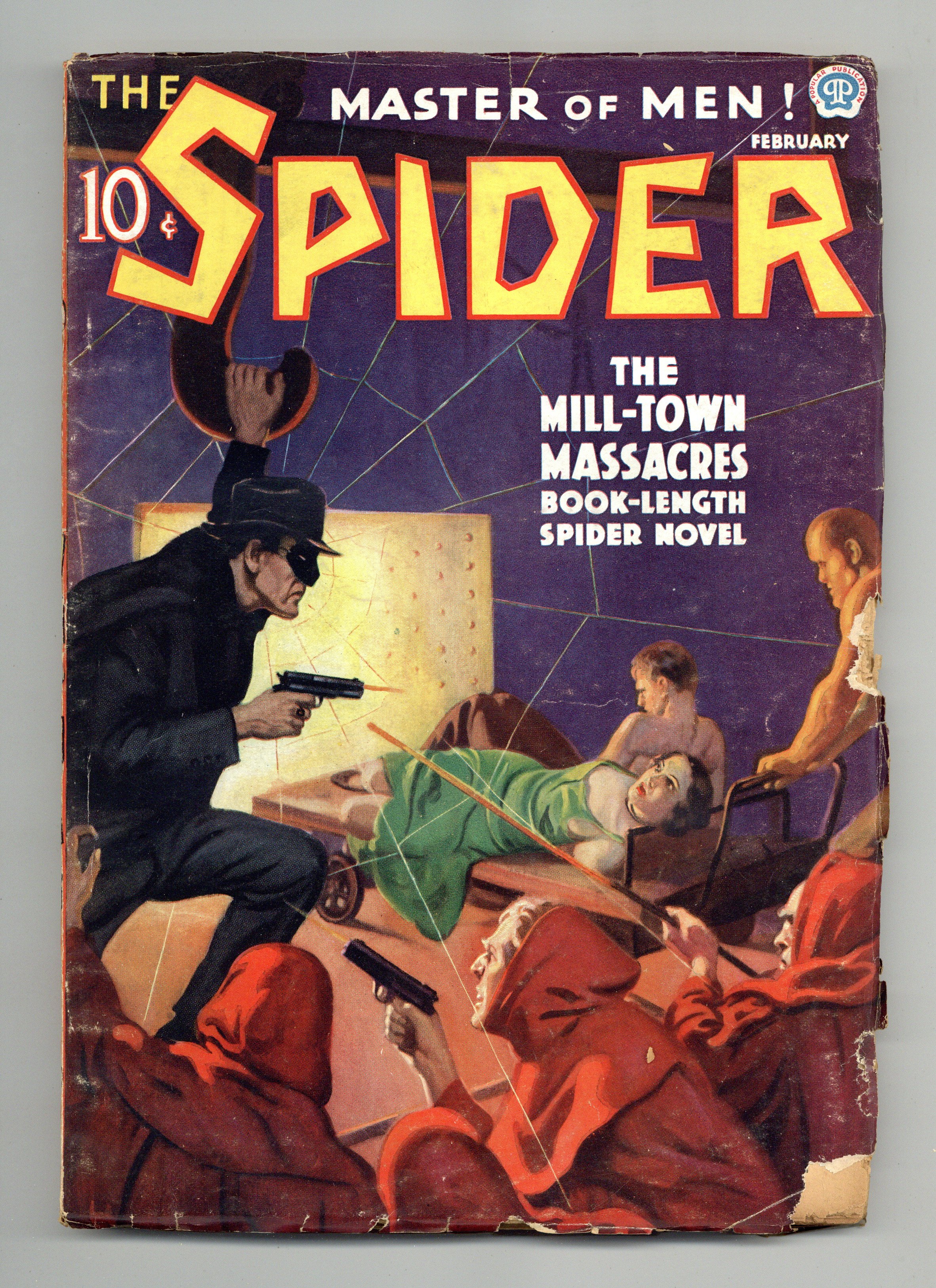 Volume 11, Issue 1 - February, 1937. Cover by John Howitt. Spider Story by Grant Stockbridge "The Mill-Town Massacres". Other stories by Arthur Leo Zagat and Frank Gruber. Anti-crime article by Inspector Leslie T. White. Illustrations by J. Fleming Gould. 7" x 10", black and white; 112 newsprint pages. Cover price $0.10.