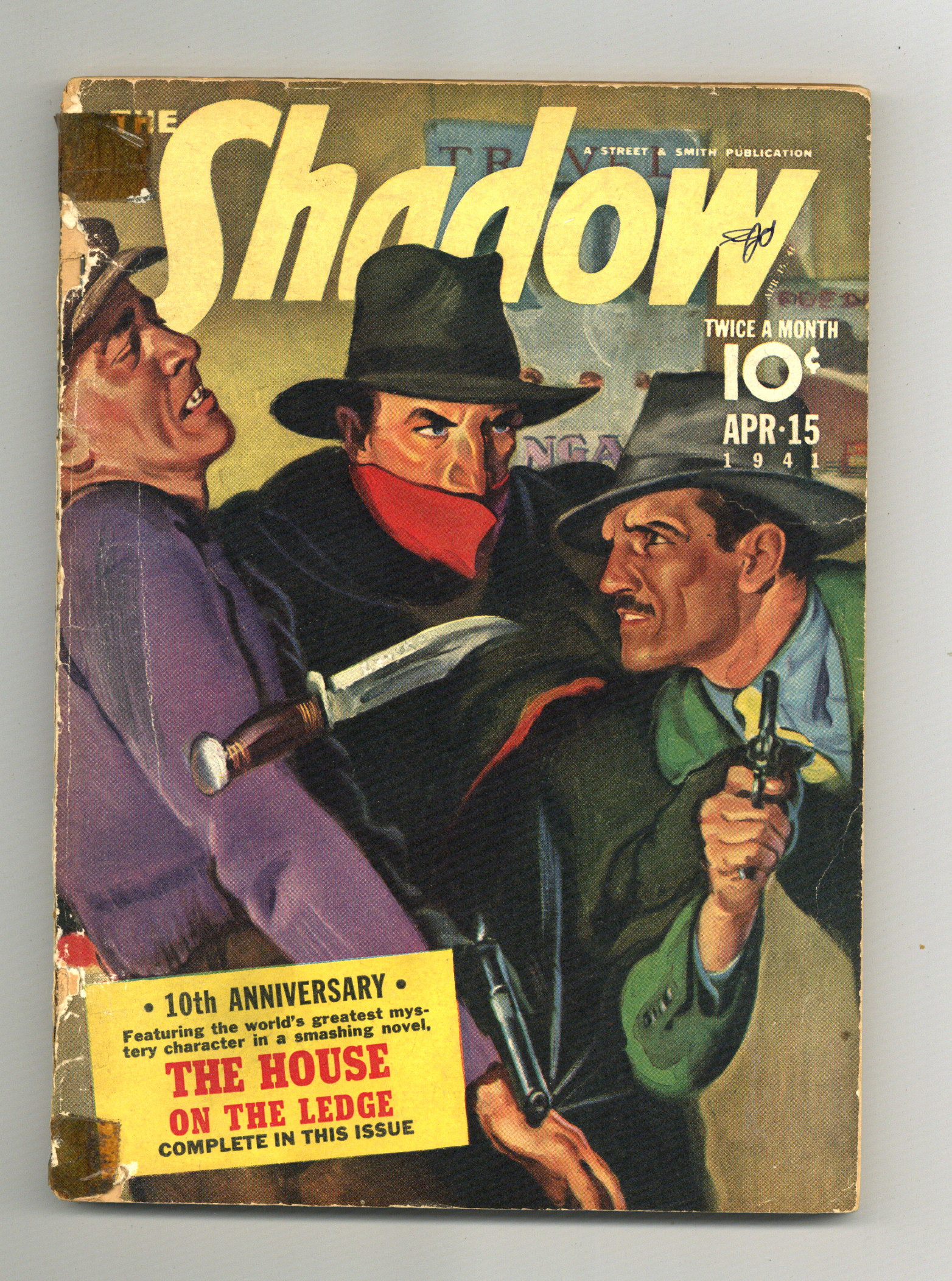 April 15, 1941. Cover by Graves Gladney. Stories include a complete Shadow novel "The House on the Ledge" by Maxwell Grant (house pseudonym). Other stories by Stafford Lewis and Ben Conlon. 6 3/4" x 9 1/4", black and white, 114 newsprint pages. Cover price $0.10.