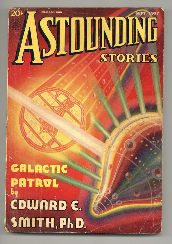Sept 1937. Volume 20, Issue 1. Cover by H. Wesso. Science fiction stories by L. Sprague De Camp ("The Isolinguals" - 1st published story by De Camp), Edward E. Smith ("Galactic Patrol" part 1), Nat Schachner, Jack Williamson ("Released Entropy" part 2 of 2), Otto Binder (as Eando Binder), Stanton A. Coblentz, and K. Raymond. Illustrations by H. Wesso, Elliot Dold Jr, M. Marchioni and C. R. Thomson. Trimmed pulp, 6.5-in. x 9.5-in.; black and white; 160 newsprint pages. Cover price $0.20.