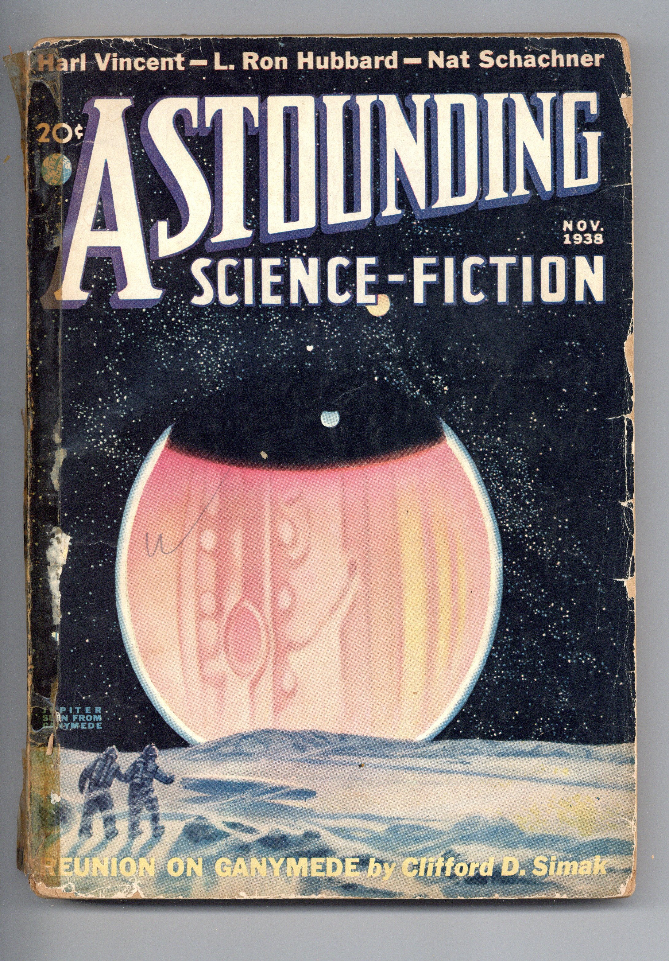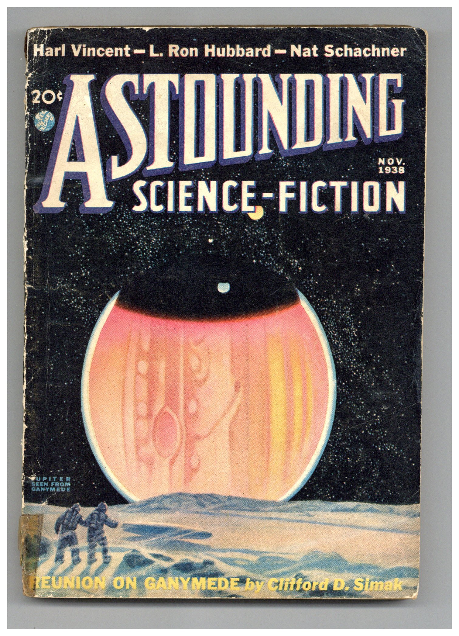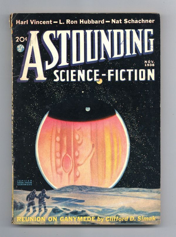 November 1938. Volume 22, Issue 3. Cover ('Jupiter seen from Ganymede') by Howard V. Brown. Science fiction stories by L. Ron Hubbard ("The Tramp" part 3 of 3), Clifford D. Simak, Royal W. Heckman, Harl Vincent, Malcolm Jameson, Nelson S. Bond, Fredrick A. Kummer Jr, and Nat Schachner ("Simultaneous Worlds" part 1 of 2). Illustrations by Howard V. Brown, Jack Binder, Paul Orban, Charles Schneeman, H. Wesso, and C. R. Thomson. Trimmed pulp, 6.5-in. x 9.5-in.; black and white; 162 newsprint pages. Cover price $0.20.