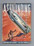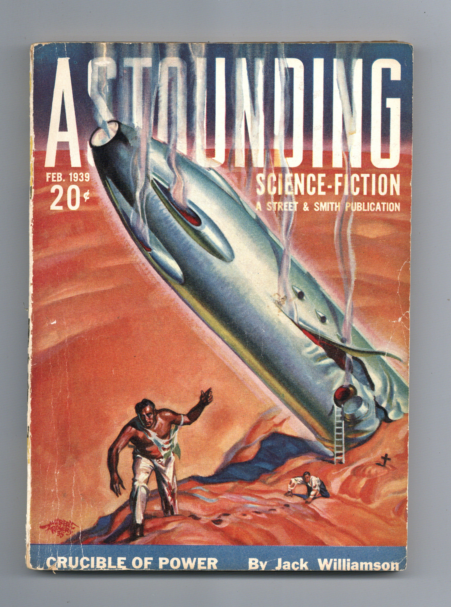 February 1939. Volume 22, Issue 6. Cover by Hubert Rogers. Science fiction stories by Clifford D. Simak ("Cosmic Engineers" part 1 of 3), Jack Williamson, Frederic A. Kummer Jr, L. Sprague De Camp ("Living Fossil"), Nat Schachner, Paul Ernst, Raymond Z. Gallun, and Don Wire. Illustrations by Jack Binder, Howard V. Brown, Hubert Rogers, Paul Orban, Charles Schneeman, and H. Wesso. Trimmed pulp, 6.5-in. x 9.5-in.; black and white; 160 newsprint pages. Cover price $0.20.