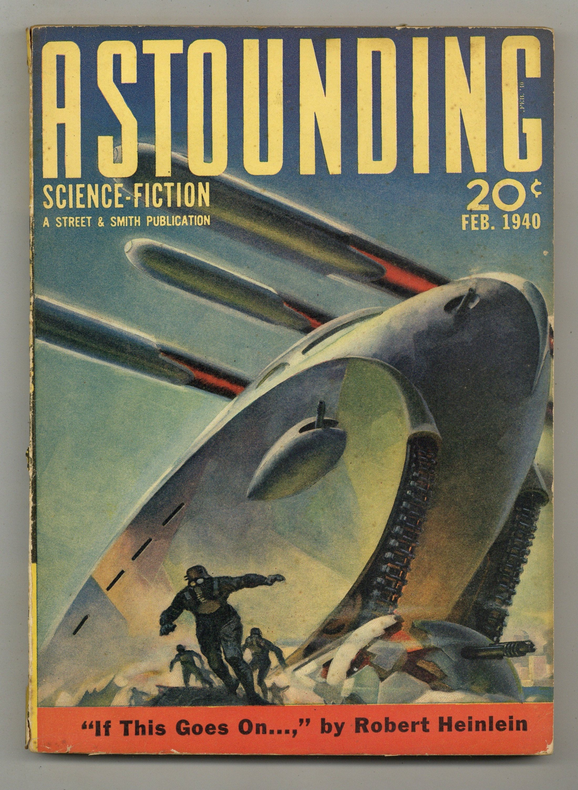 February, 1940. Volume 24, Issue 6. Cover by Hubert Rogers. Robert Heinlein ("If This Goes On -" part 1 of 2) Trimmed pulp, 6.5-in. x 9.5-in.; black and white; 160 newsprint pages. Cover price $0.20.