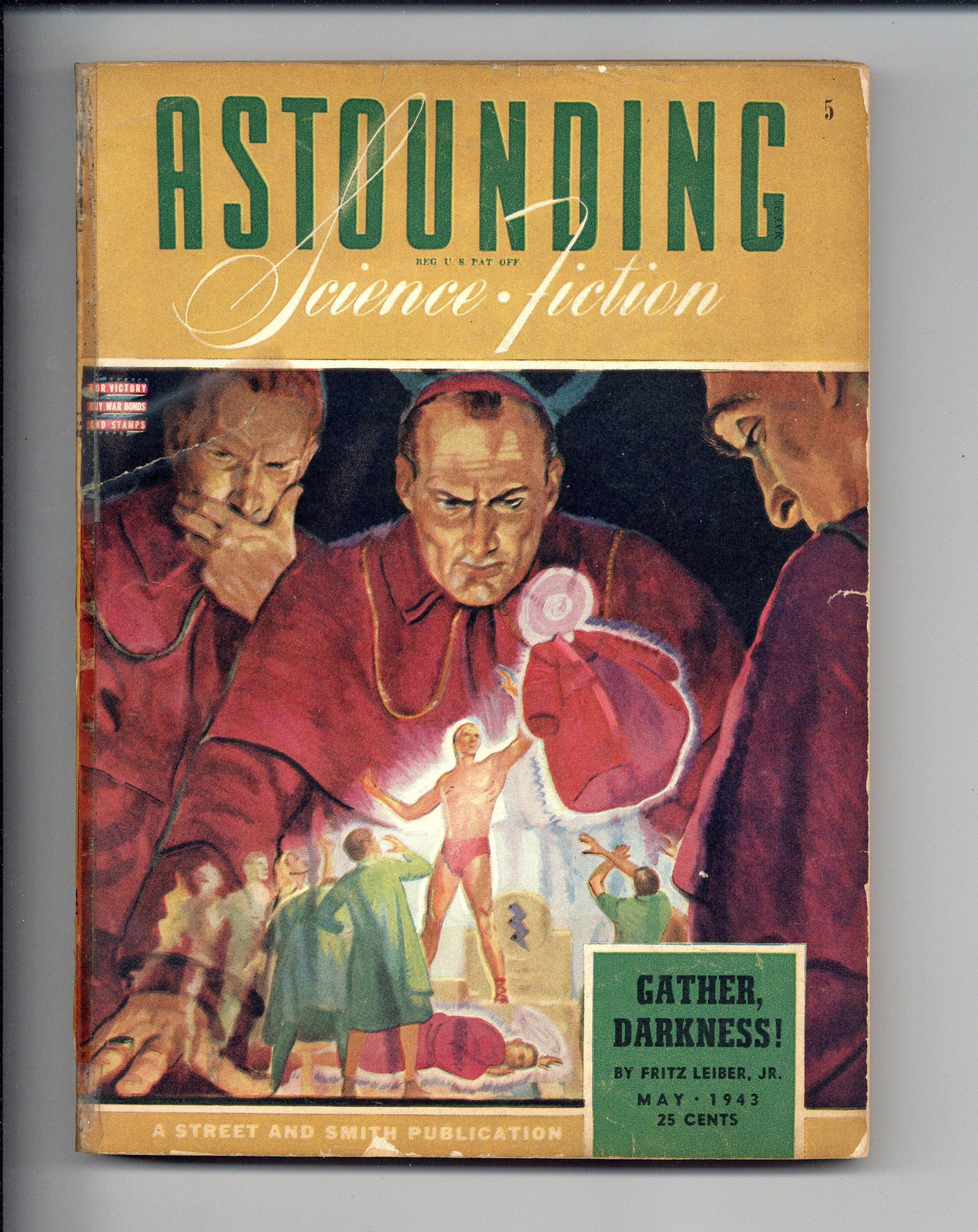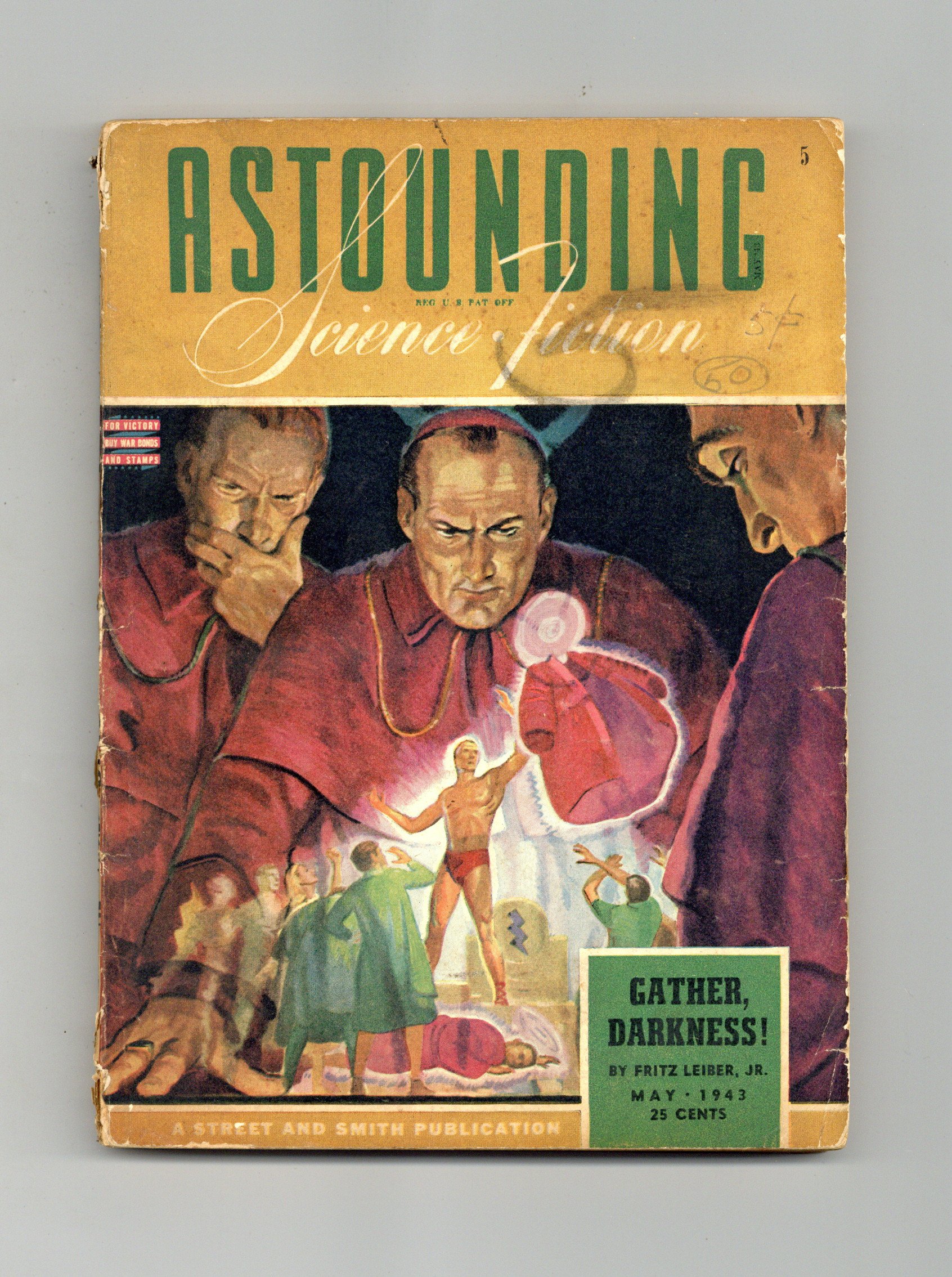 Volume 31, Issue 3 - May, 1943. Volume 31, Issue 3. Return to trimmed pulp format. Cover by William Timmins. "Gather, Darkness!" part 1 of 3 by Fritz Lieber. Other science fiction stories by Henry Kuttner, Raymond F. Jones, Lester Del Rey (as John Alvarez), & Cleve Cartmill. Interior illustrations by Frank Kramer & Paul Orban. Trimmed pulp, 6.5-in. x 9.25-in.; black and white; 164 newsprint pages. Cover price $0.25.