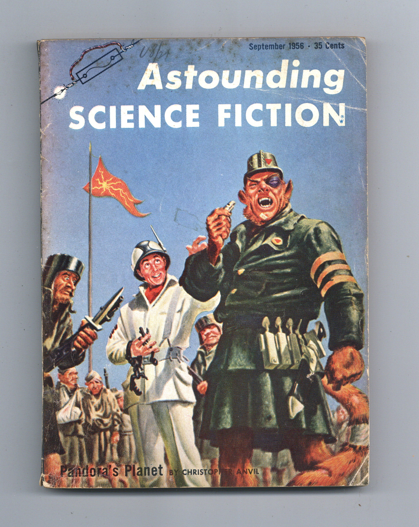 Published Sep 1956 by Street & Smith.$3.00September 1956. Cover by Freas. Stories: "Pandora's Planet" by Christopher Anvil, "The Swamp Was Upside Down" by Murray Leinster, "Margin of Profit" by Poul Anderson, "Dust Rag" by Hal Clement, and "Mind for Business" by Robert Silverberg. Special Feature: "Pate de Foie Gras" by Isaac Asimov. Softcover, 5.5-in. x 7.75-in.; 162 newsprint pages, B&W. Cover price $0.35.
