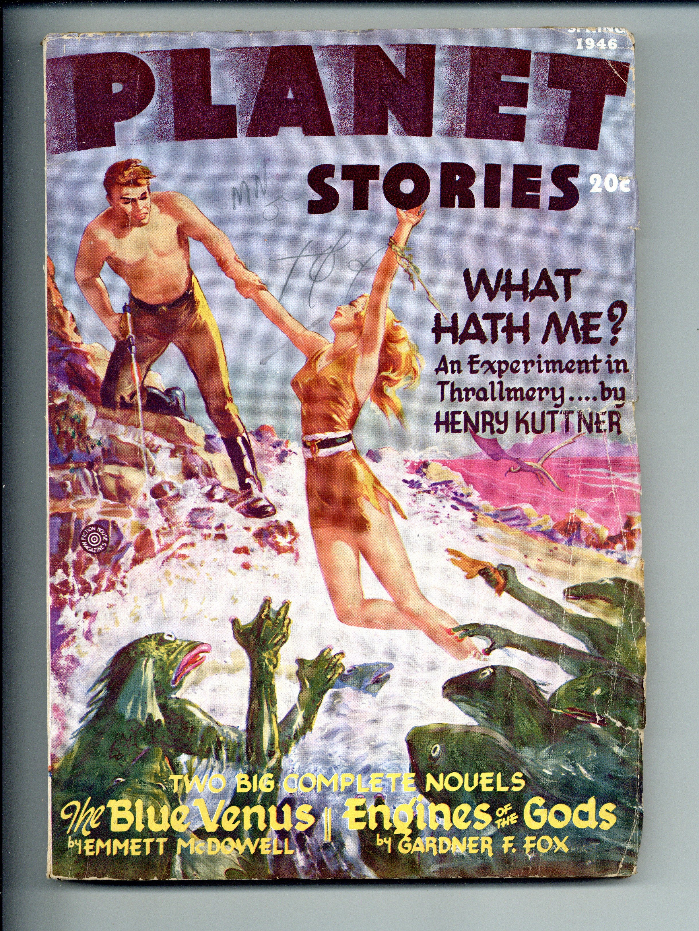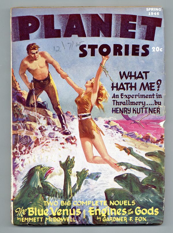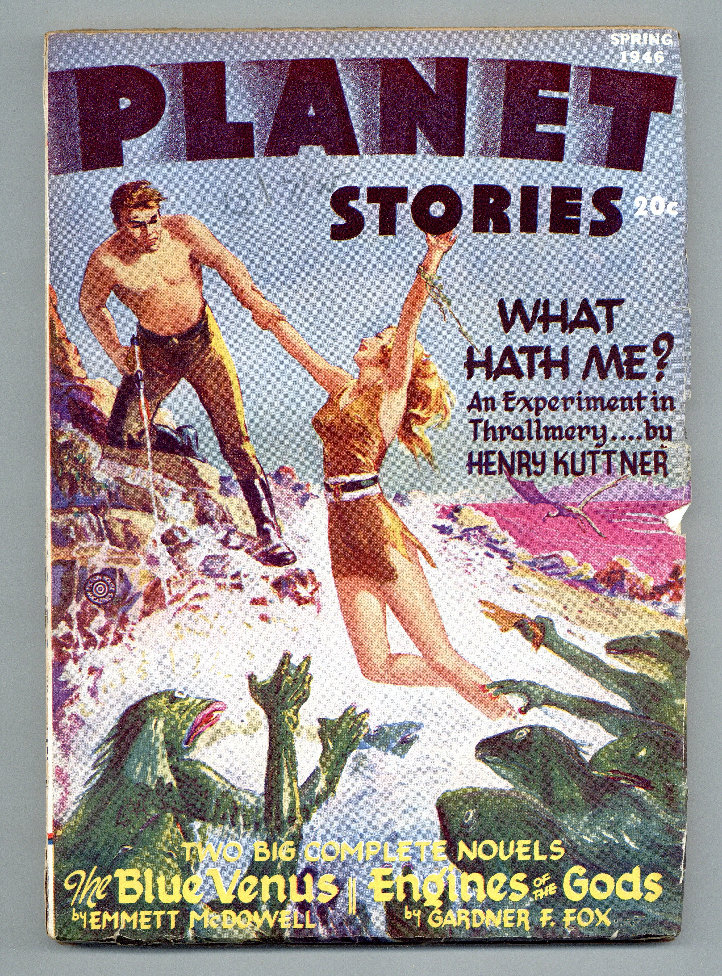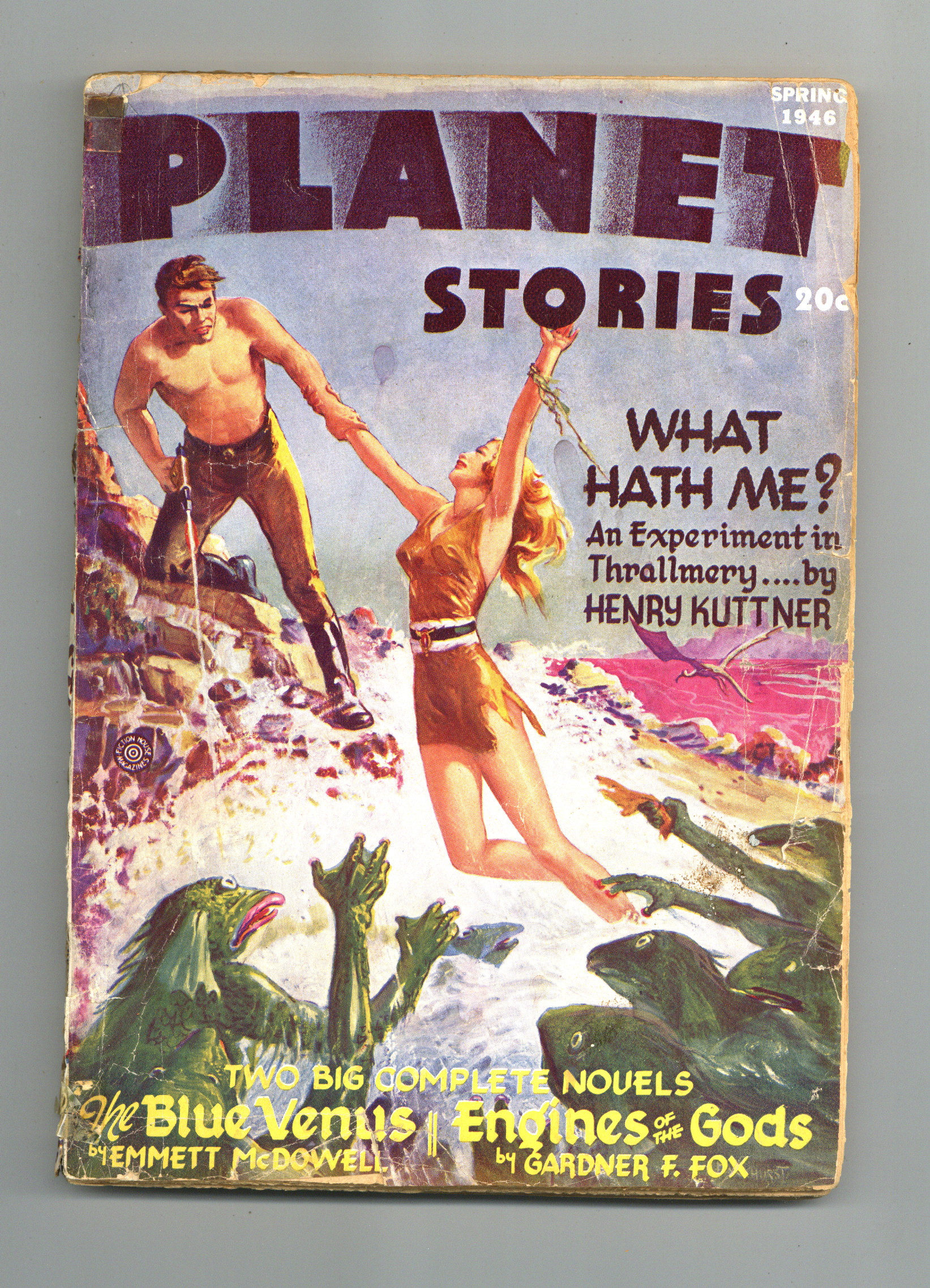 "Defense Mech" a short story by Ray Bradbury, "Engines of the Gods" a novel by Gardner Fox, plus "What Hath Me?" a novelette by Henry Kuttner.
