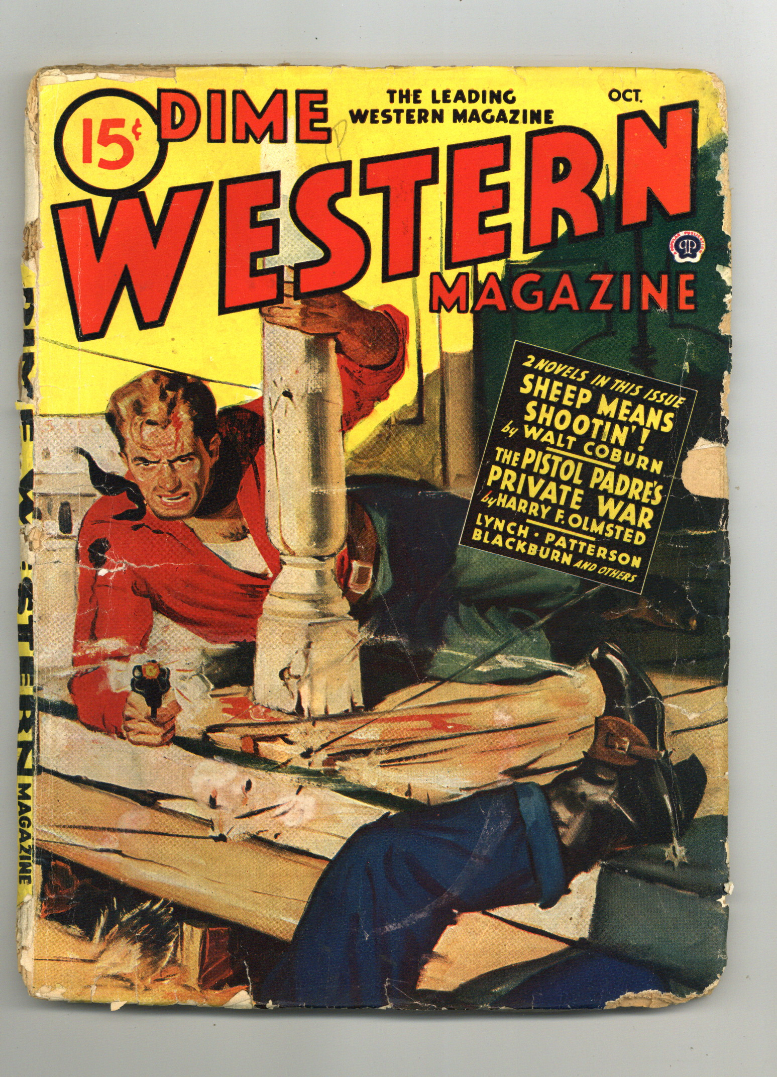 Volume 44, Issue 2 - October, 1945. Western adventure novels "Sheep Means Shootin'" by Walt Coburn and "The Pistol Padre's Private War" by Harry F. Olmstead. Novelettes "Tinhorns -- And Iron Men" by Rod Patterson, "Smoke-Out at Silver River" by James Charles Lynch, and "Snow-Bound in Hell" by Marvin De Vries. Short stories by Joe Archibald & Tom W. Blackburn. A few illustrations. 6.75" x 9.75", 98 pages, B&W. Cover price $0.15.