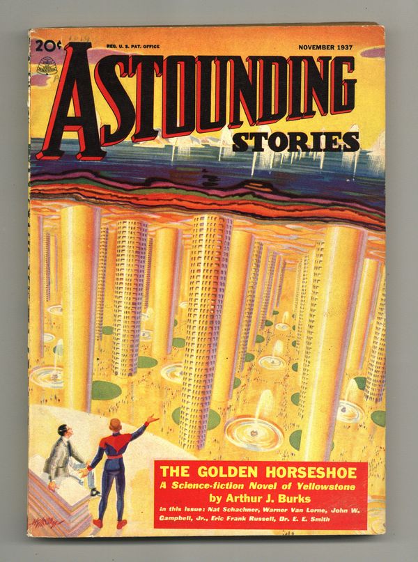 Volume 20, Issue 3 - November, 1937. Volume 20, Issue 3. Cover by Wesso. Science fiction stories including "The Golden Horseshoe, a Science Fiction Novel of Yellowstone" by Arthur J. Burks. Other writers include Nat Chachner, warner Van Lorne, John W. Campbell Jr, Eric Frank Russell and Dr. E.E. Smith. Trimmed pulp, 6.5-in. x 9.5-in.; black and white; 6.5" x 9.5", 162, B&W. Cover price $0.20.