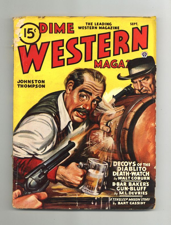 September 1946. Western adventure novels "Decoys of the Diablito Death-Watch'" by Walt Coburn and "B-Bar Baker's Gun-Bluff" by Marvin De Vries. Novelettes "The Outcast Rides Back" by Van Cort. Short story "Hundred-Dollar Epitaph" by William Benton Johnston. A few illustrations. 7-in. x 9 1/2-in.; black and white; 98 newsprint pages. Cover price $0.15.