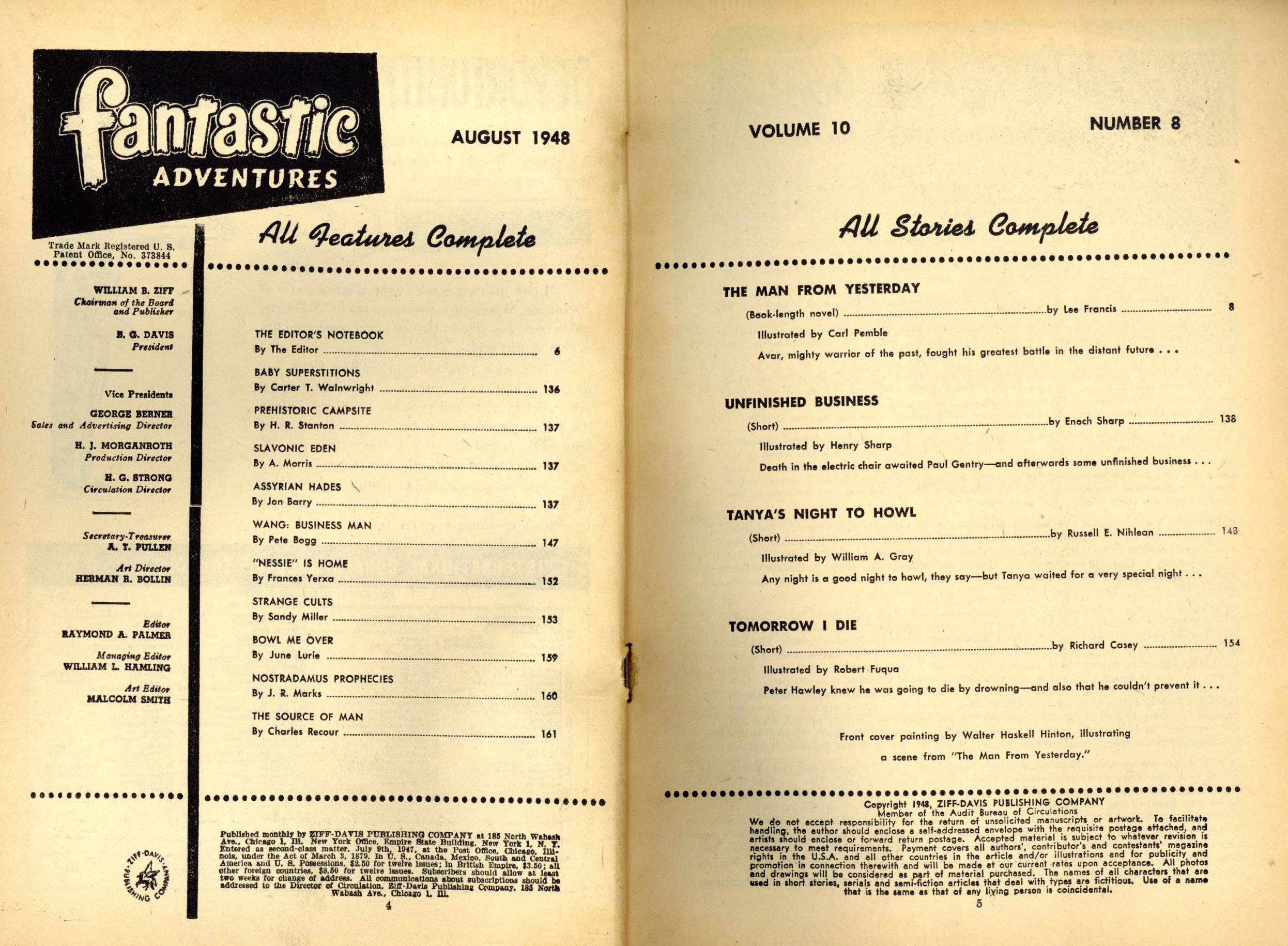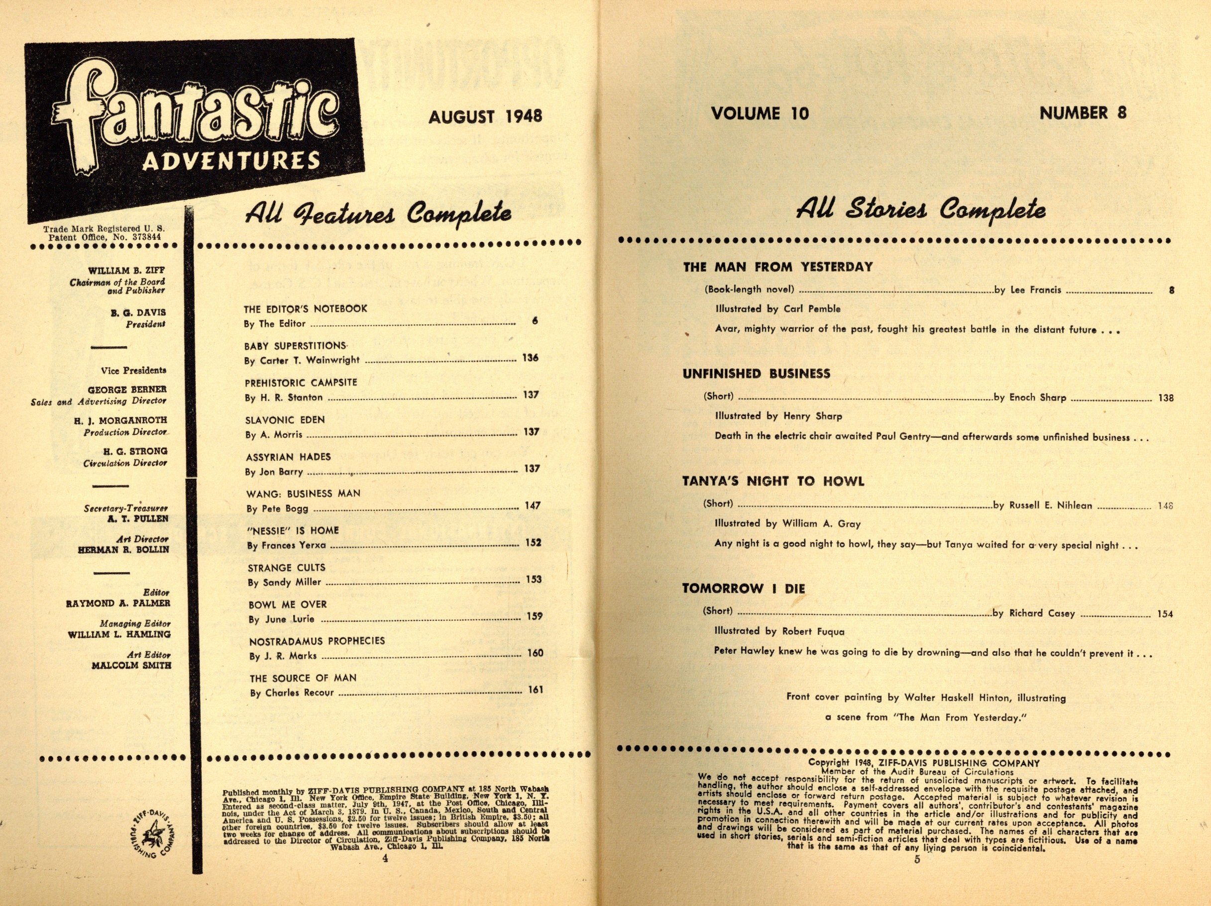 Volume 10, Issue 8 - August, 1948. Cover by Walter Haskell Hinton. Science Fiction and Adventures stories. This issue features "The Man From Yesterday" by Lee Francis. Softcover Pulp, 7-in x 10-in, 166 Pages, B&W. Cover price $0.25.