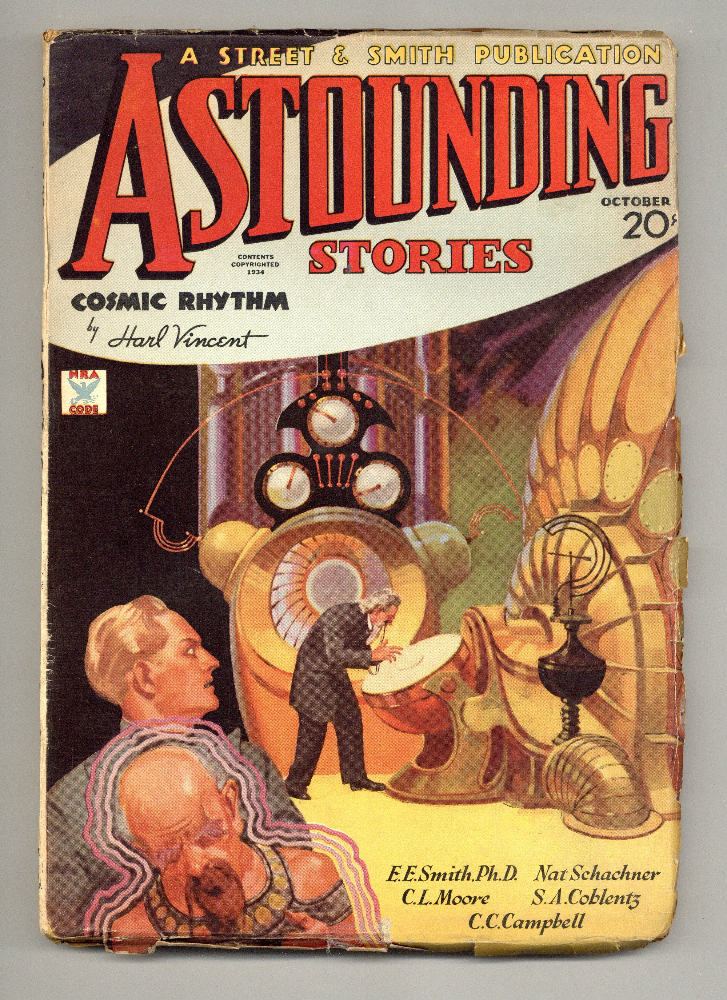 Volume 14, Issue 2 - October 1934. Science Fiction and Adventure stories. This issue features "The Cosmic Rhythm" by Harl Vincent, and stories by E.E. Smith, Nat Schachner, C.L. Moore, S.A. Coblentz, and C.C. Campbell. 144 pages, B&W Cover price $0.20.