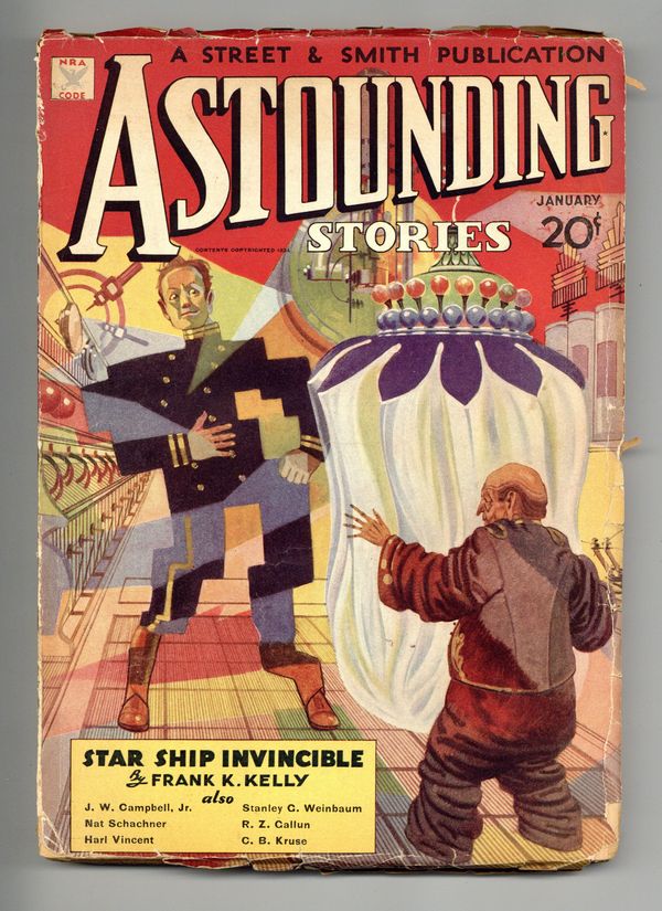 Volume 14, Issue 5 - January 1935. Science Fiction and Adventure stories. This issue features "Star Ship invincible" by Frank K. Kelly, and stories by J. W. Campbell Jr., Nat Schachner, Harl Vincent, Stanley G. Weinbaum, R.Z. Callun, and C.B. Kruse. 144 pages, B&W Cover price $0.20.