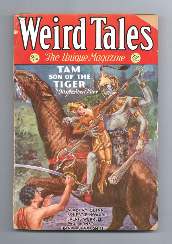 Volume 18, Issue 2 - September 1931. Edited by Farnsworth Wright. Pulp magazine specializing in Horror and Science Fiction stories. This issue features "Tam, Son of the Tiger: Part 3" by Otis Adelbert Kline, plus stories by Seabury Quinn, Robert E. Howard, Everil Worrell, Paul Ernst, and Clark Ashton Smith. 6.75-in. x 10-in.; 128 newsprint pages, text (with B&W illustrations). Cover price $0.25.