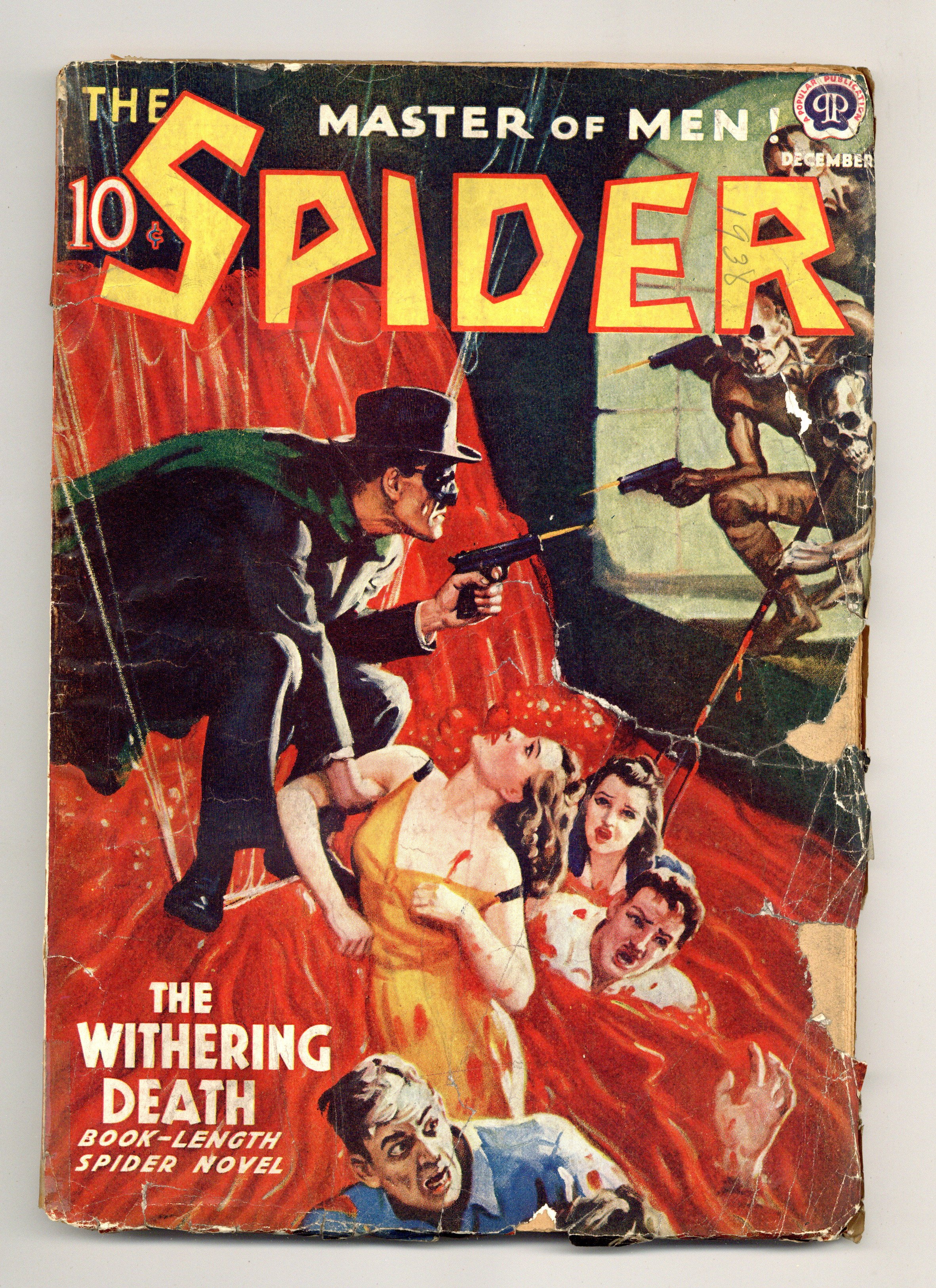 Dec 1938. Cover by John Howitt. Spider Story by Grant Stockbridge "The Withering Death". Crime-fighting article by Moran Tudury. Illustrations by J. Fleming Gould. 7" x 10", black and white; 112 newsprint pages. Cover price $0.10.