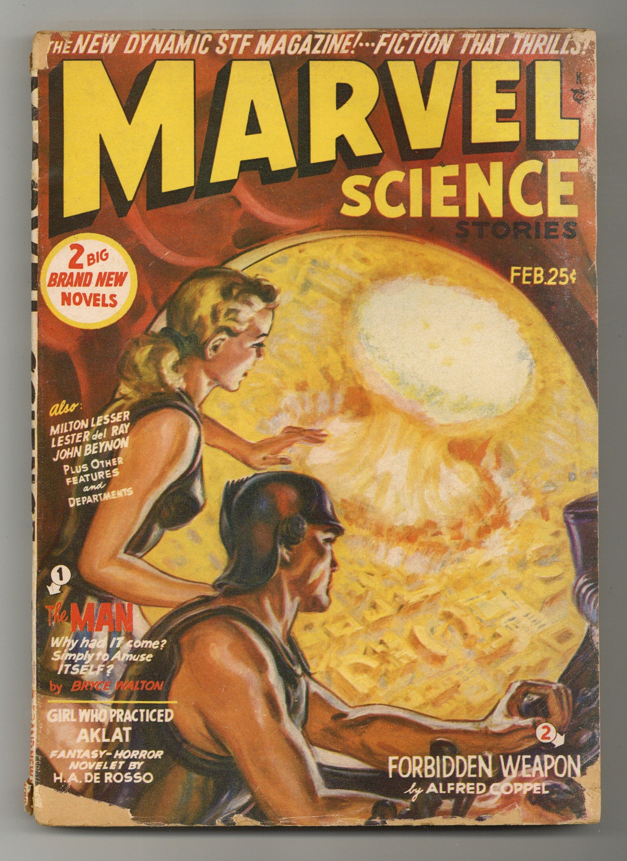 February 1951. Atomic Blast cover by Norman Saunders. Science Fiction Stories: "The Man" by Bryce Walton, "Forbidden Weapon" by Alfred Coppel, "The Red Stuff" by John Beynon, "Girl Who Practiced Aklat" by H. A. DeRosso, "The Last Spaceman" by Lester Del Rey, "Trans-Plutonian" by Milton Lesser, "The Difference" by Kenneth O'Hara, plus other editorial features. Illustrations by Vincent Napoli. Softcover Pulp, 6 1/2-in x 9 1/4-in, 134 Pages, B&W. Cover price $0.25.