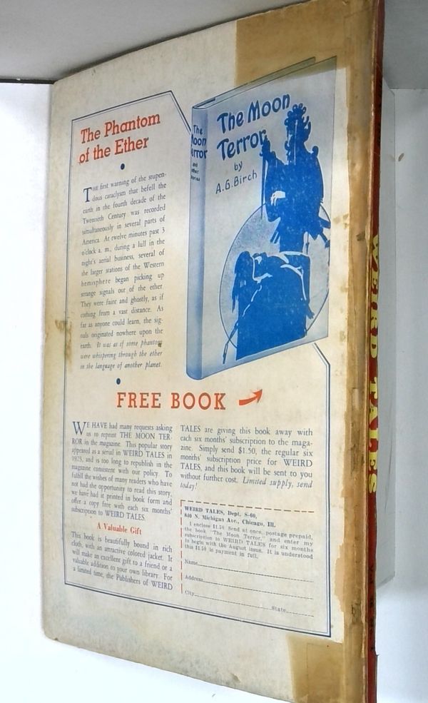 Tags: Anthology / CollectionPublished Jul 1935 by Weird Tales.$77.00- Front cover detached 10%. Back cover detached 10%. Water damage: Extensive. Staple rust: Moderate.