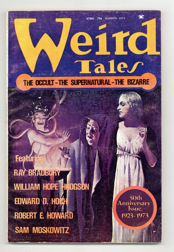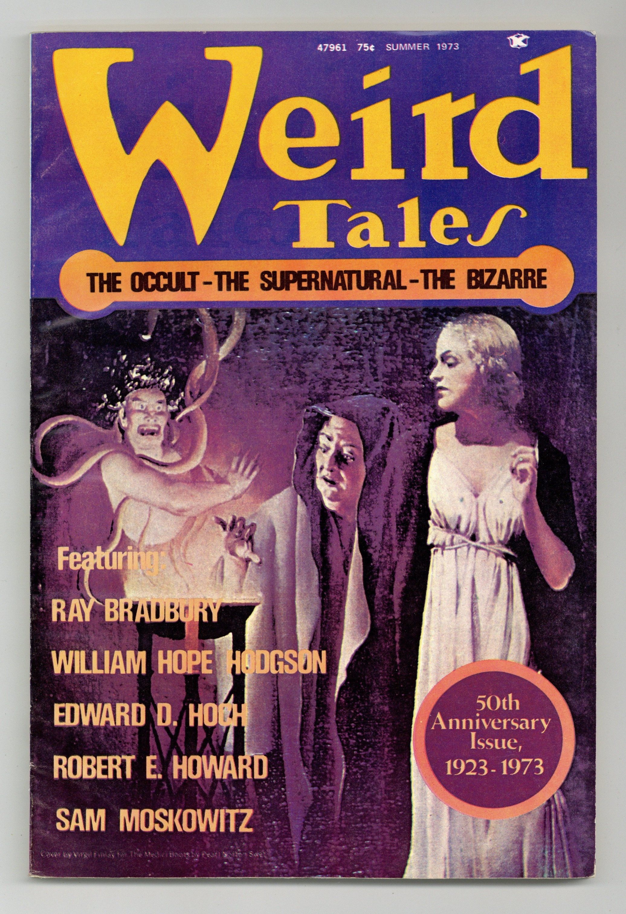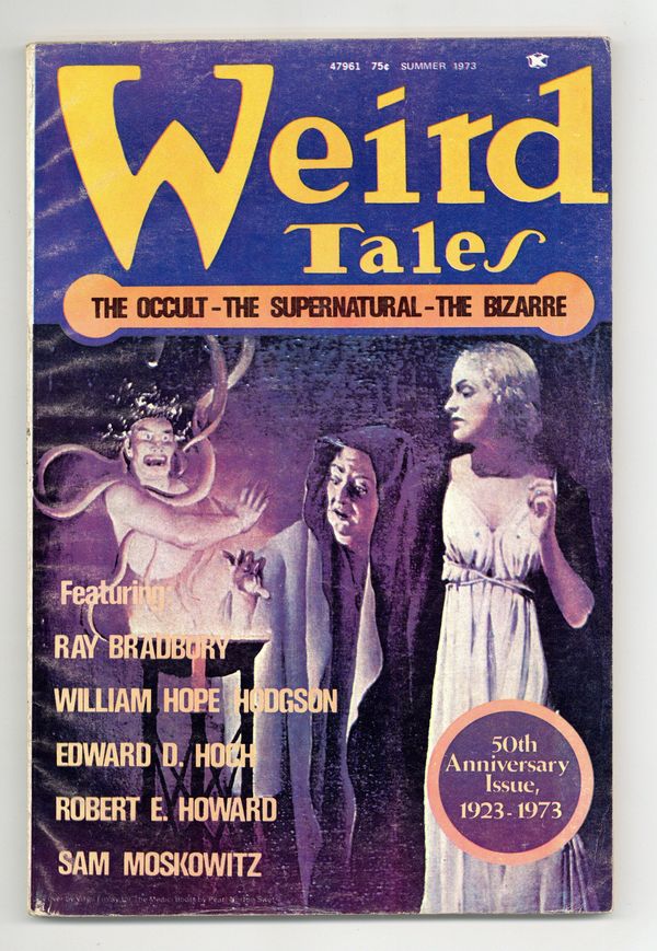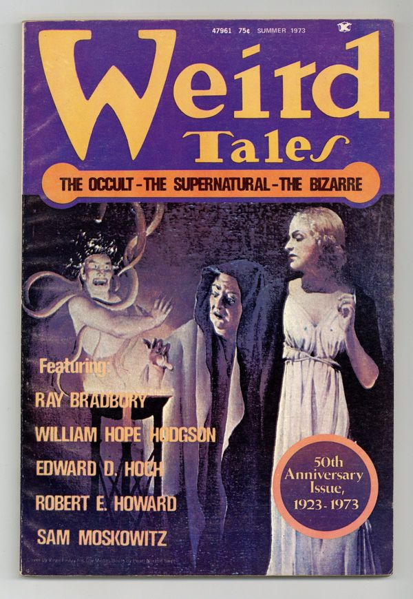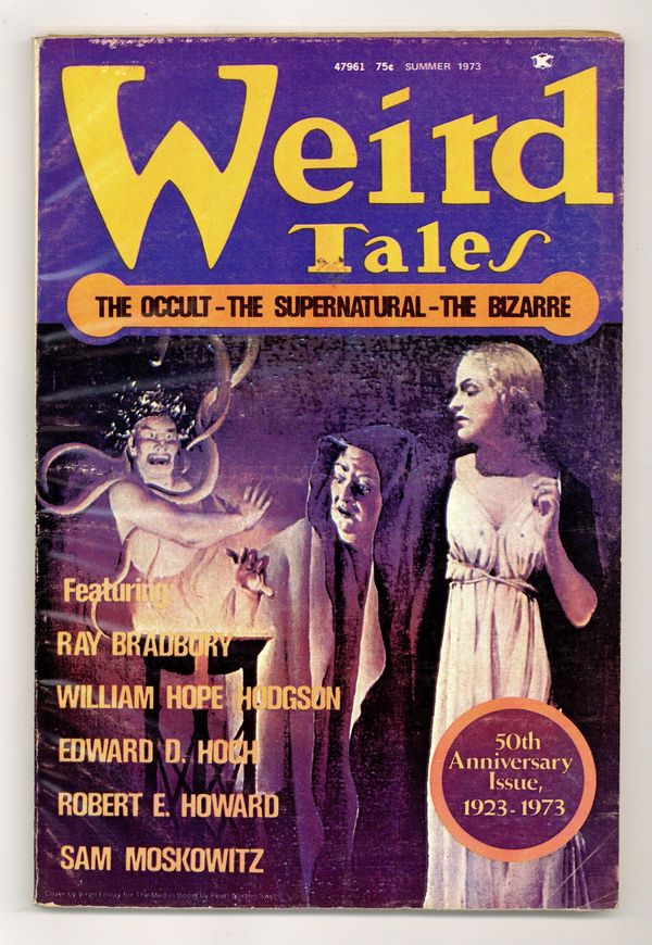 Published Jun 1973 by Weird Tales.$11.00Volume 47 - #1 - 1st printing. Relaunch of the magazine in the Summer of 1973. Stories include: "The Watchers" (by Ray Bradbury), "Perdita" (Hilgarde Hawthorne), "Spear and Fang" (Robert E. Howard), "Funeral in the Fog" (Edward D. Hoch), "The Guest of Honour" (Frank Norris), "The Sign of Venus" (Robert W. Chambers), "The Early Years" (Sam Moskowitz), "The Woman in Red & Unmasked" (Muriel Cambell Dyar), "The Serpent City" (Edison Marshall), "A Tropical Horror" (William Hope Hodgson), "Sylvane--The Silver Birches" (verse by A. Merritt), "The Man With the Brown Beard" (Nathaniel T. Babcock), "The Black Hands" (Albert Bigelow Paine), "The Medici Boots" (Pearl Norton Swet), and "The Canal" (verse by H.P. Lovecraft). Virgil Finlay painted cover. Mostly text (handful of illustrations). Softcover, 6-in. x 9-in., 96 pages, Text (with B&W Chapter Illustrations). Cover price $0.75.