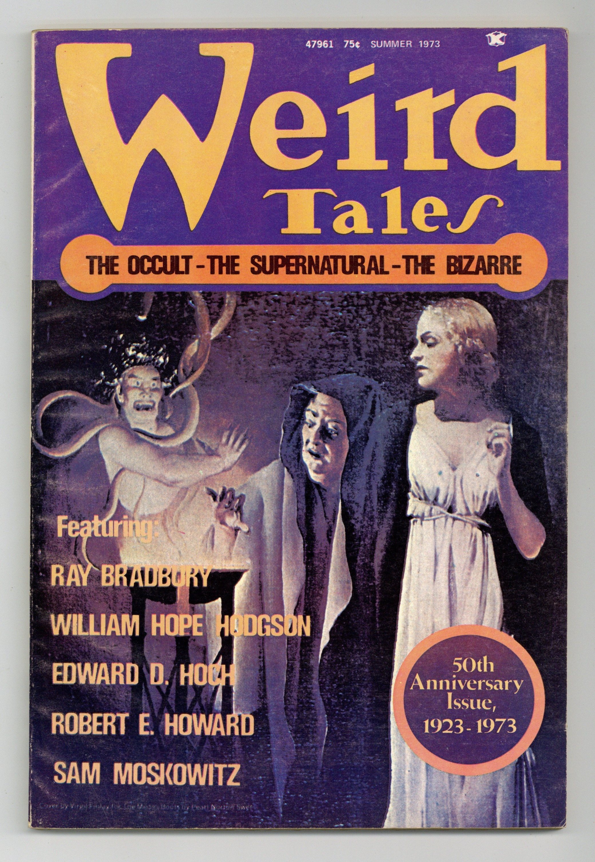 Published Jun 1973 by Weird Tales.$10.00Volume 47 - #1 - 1st printing. Relaunch of the magazine in the Summer of 1973. Stories include: "The Watchers" (by Ray Bradbury), "Perdita" (Hilgarde Hawthorne), "Spear and Fang" (Robert E. Howard), "Funeral in the Fog" (Edward D. Hoch), "The Guest of Honour" (Frank Norris), "The Sign of Venus" (Robert W. Chambers), "The Early Years" (Sam Moskowitz), "The Woman in Red & Unmasked" (Muriel Cambell Dyar), "The Serpent City" (Edison Marshall), "A Tropical Horror" (William Hope Hodgson), "Sylvane--The Silver Birches" (verse by A. Merritt), "The Man With the Brown Beard" (Nathaniel T. Babcock), "The Black Hands" (Albert Bigelow Paine), "The Medici Boots" (Pearl Norton Swet), and "The Canal" (verse by H.P. Lovecraft). Virgil Finlay painted cover. Mostly text (handful of illustrations). Softcover, 6-in. x 9-in., 96 pages, Text (with B&W Chapter Illustrations). Cover price $0.75.