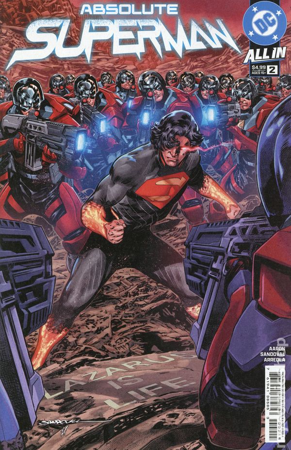 Written by Jason Aaron. Art by Rafa Sandoval. Cover by Rafa Sandoval. SUPERSTARS JASON AARON AND RAFA SANDOVAL UNLEASH A SHOCKING NEW TAKE ON THE LAST SON OF KRYPTON! Without the fortress...without the family...without a home...what's left is the Absolute Man of Steel! 44 pages, full B&W. Rated T+ Cover price $4.99.