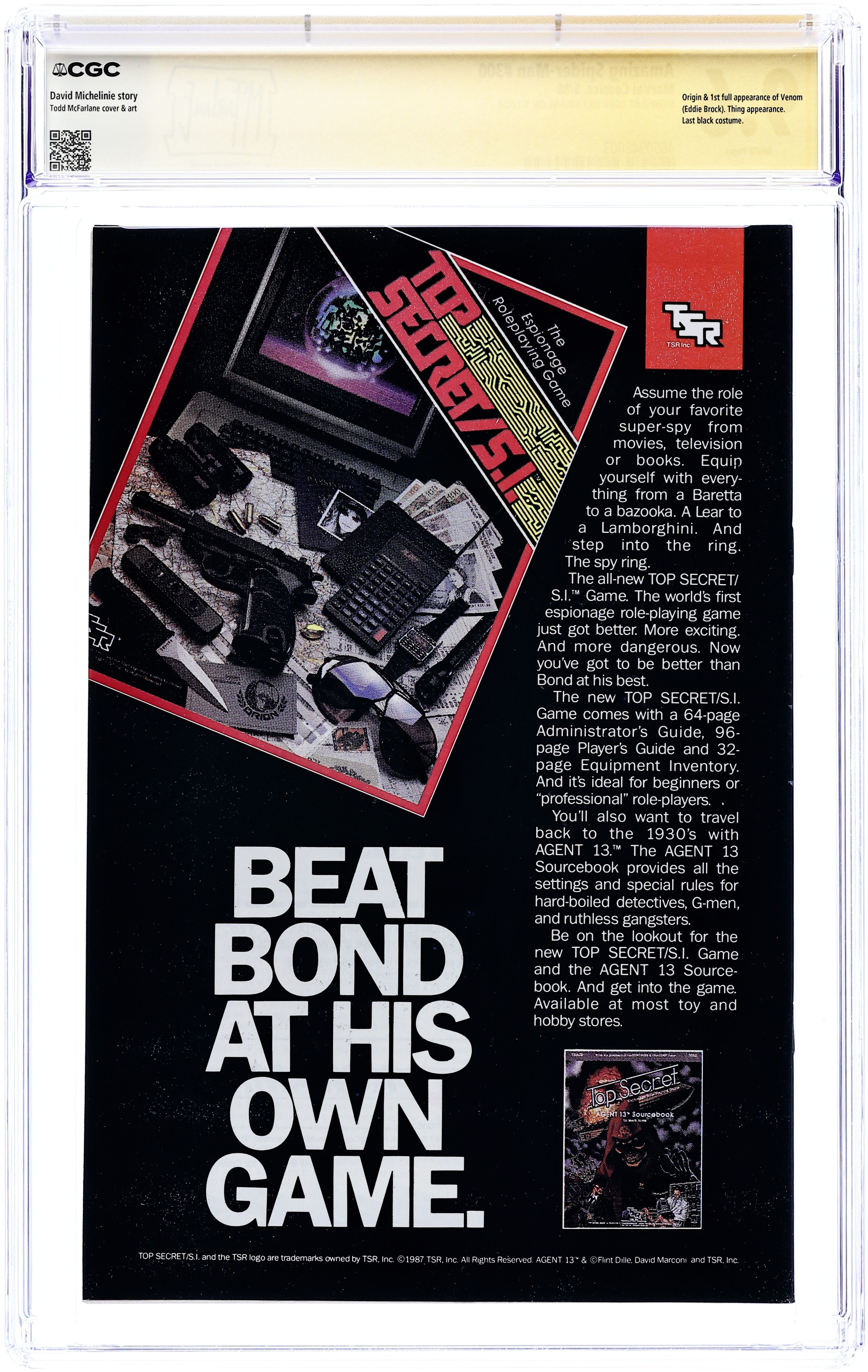 Ends Mar 30 7:14 PM CST Bid History 10 bids Current Bid $400 Your Secret Max Bid If you'd like to bid, please log in or register. Direct Edition. Giant-sized 25th anniversary issue. First full appearance of Venom in "Venom!", script by David Michelinie, art by Todd McFarlane; Spidey's old alien costume has merged with reporter Eddie Brock who thinks his career was ruined by Spider-Man and the symbiote of the two, Venom, takes on the web slinger; At MJ's request, Spidey returns to the blue and red costume as she now finds his black duds way too creepy; This is the last issue in which Spider-Man appears in his black costume; Thing (of the Fantastic Four) cameo.. Stan's Soapbox Special in place of letters page: Full page editorial by Stan on the occasion of Spider-Man's 300th issue. 52 pgs., full color. Cover price $1.50.