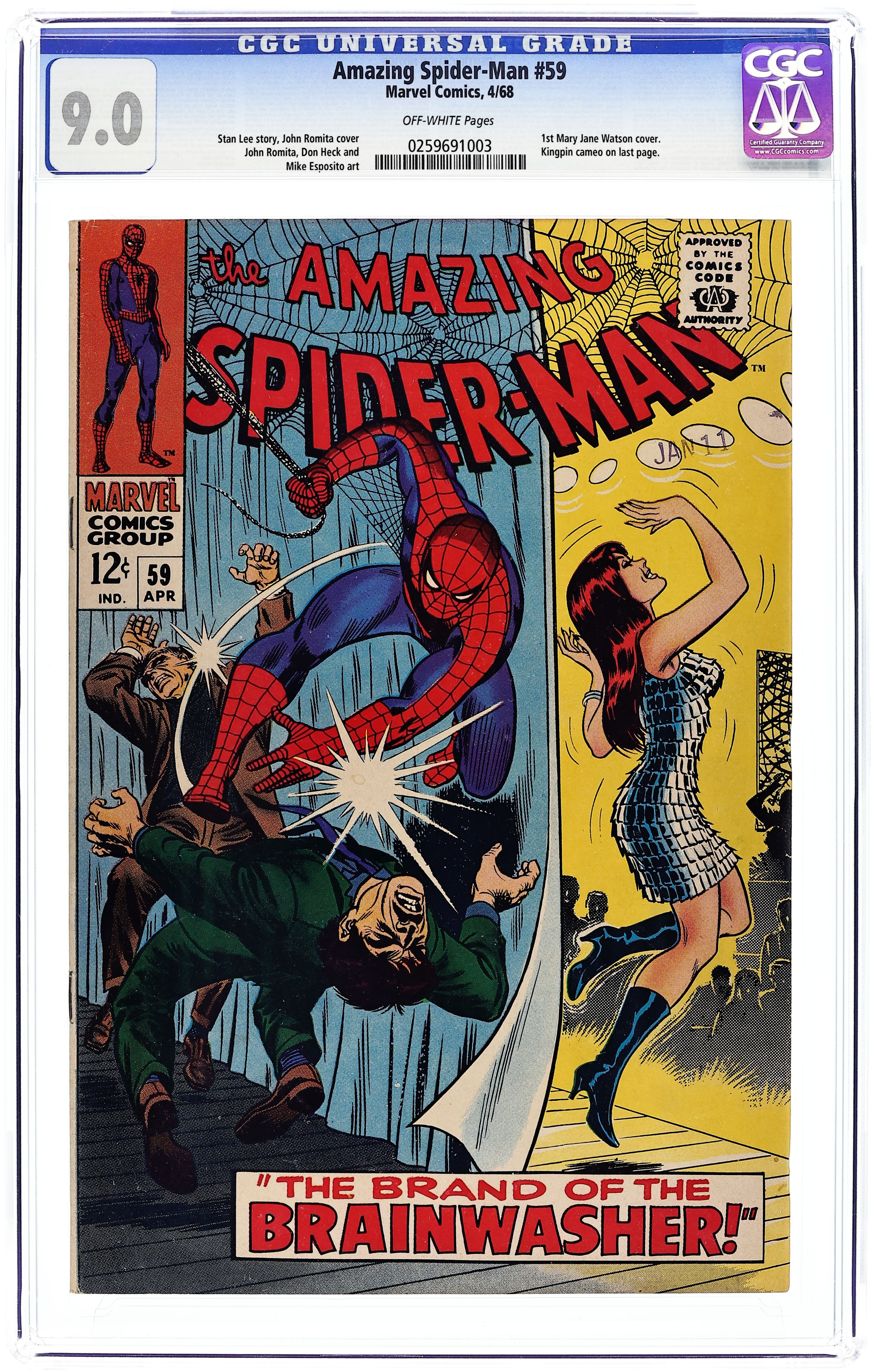 Starts Jan 3 First cover appearance of Mary Jane Watson in "The Brand of the Brainwasher!" Part 1 of 3. Script by Stan Lee. Art by John Romita (layouts) and Don Heck (pencils). Inks by Mike Esposito (as Mickey Demeo). Classic cover by John Romita. Mary Jane has a new job as a go-go dancer at the Gloom Room nightclub! And for MJ's opening night many of her friendsand city officials -- including Captain George Stacy -- attend the show. Interestingly, Mary Jane has a second task for the evening: take pictures of the club's guests with a special camera. After MJ snaps a photo of Gwen's father, he begins acting strangely and then disappears! Who is the owner of this nightclub by the way? Peter suspects that something is amiss, so he quickly changes clothes and swings into action! The night began with Peter Parker on a date with Gwen Stacy...and ends with the Amazing Spider-Manrescuing Mary Jane Watson! A fun issue! Cameo appearances by Aunt May, Harry Osborn, and the Kingpin. (Notes: This story was reprinted in Marvel Tales #42. This issue includes a statement of ownership: average print run: 587,213; average paid circulation 361,663.) 36 pages. Cover price $0.12.