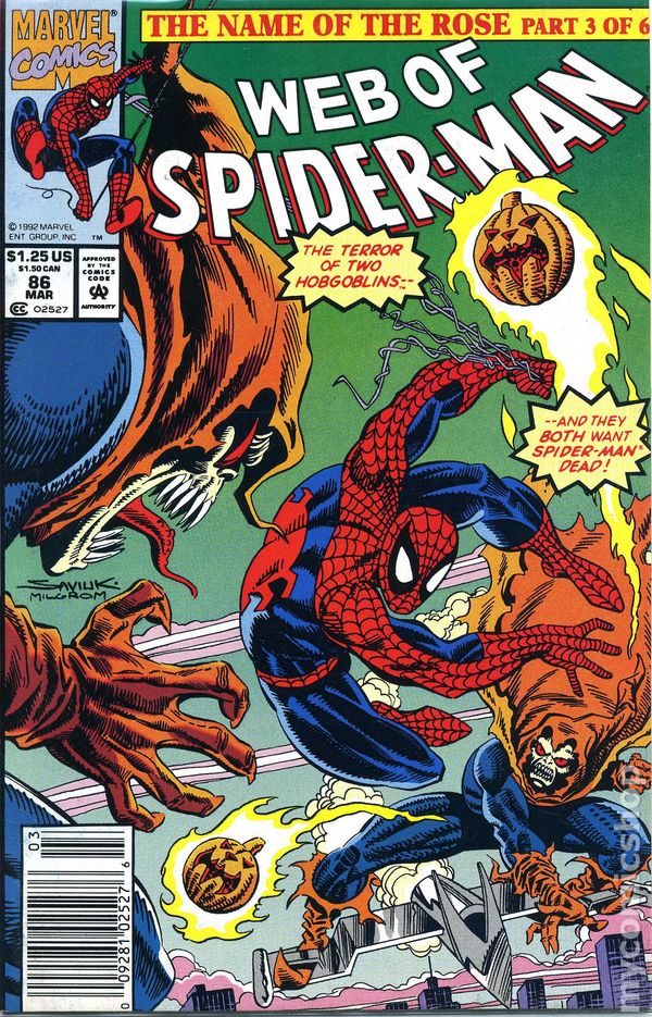 "Storm Shadows" Part 1 of 4. Guest-starring Ghost Rider and Johnny Blaze. Script by Howard Mackie. Pencils by Alex Saviuk. Inks by Joe Rubinstein. Cover by Alex Saviuk. The forces of good and evil gather in New York City for a bizarre night of all-out action! While taking the Hobgoblin to the police station, the web-slinger and his prisoner are ambushed by the Demogoblin and the eight-legged doppelganger! So on the rooftops overlooking Manhattan, the goblins and the spiders battle for their lives…and other people's deaths! Meanwhile in the tunnels underneath Manhattan; Johnny Blaze, Ghost Rider, and Venom track down Hag, Troll, and the Deathspawn for a savage struggle in the sewer system! Powerfully the two conflicts merge at ground level in a midtown church…and the wild free-for-all gets even wilder! Venom vs. the doppelganger! The Demogoblin vs. Ghost Rider! The Hobgoblin vs. the Deathspawn! And of course, your friendly neighborhood Spider-man is caught in the middle of everything! Story continues in Ghost Rider & Blaze Spirits of Vengeance 5. (Notes: This issue begins the four-part Spirits of Venom storyline. This issue includes a full-page ad (and cover preview) for the 1992 Spider-Man Special Edition (UNICEF): Trial of Venom.) 32 pages Cover price $1.25.