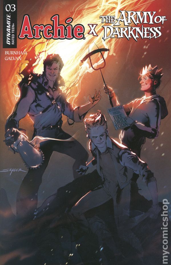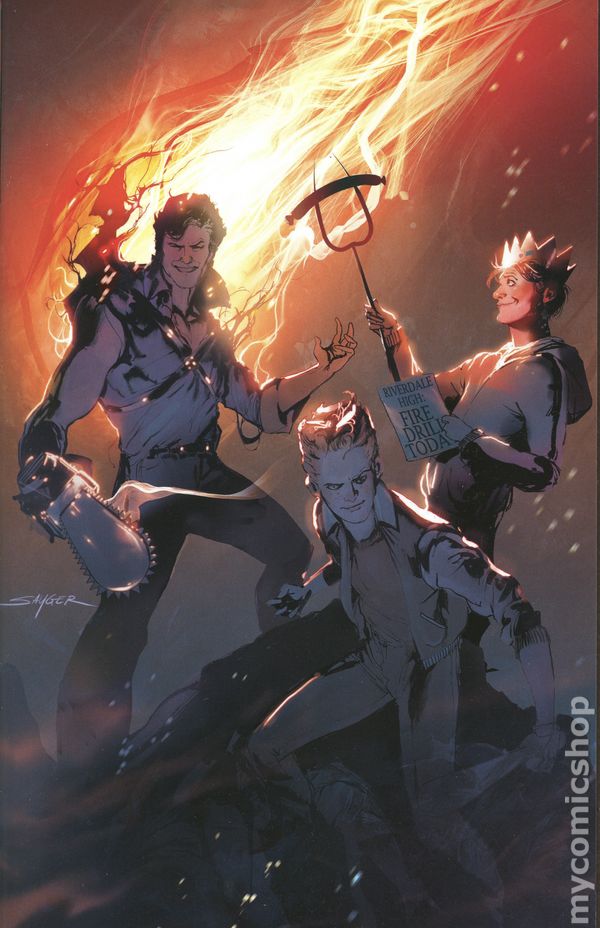 Limited 1 for 10 Retailer Incentive Variant Cover. (W) Erik Burnham (A) Bill Galvan (CA) Stuart Sayger ITS A DEADITE PARTY! Reggies lake house soirée was supposed to be the social event of the season, but now it may prove to be the town of Riverdales swan song! Following Archie Andrewss unwitting awakening of the Army of Darkness, chaos — in the form of an undead horde — has descended upon the shore. With slavering evil literally at their doorstep, the gang has only one hope of making it out alive — the Savior of S-Mart, one Ashley J. Williams. Unluckily for them, the Chosen Ones car currently has four flat tires! 32 pages, full color, rated T+. Cover price $4.99.